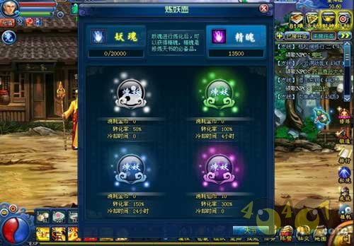 要想开启天书的秘密,首先要用到一个道具——炼妖壶。在副本中击杀妖兽所获得的妖魂通过炼妖壶炼化后可获得精魄,精魄是解读天书的重要媒介。炼妖壶有四种不同的转化模式,转化率不同,冷却时间也不同,玩家可以根据自己需求进行转化。