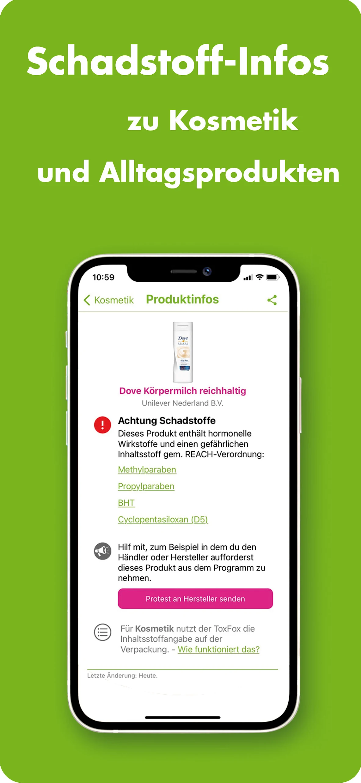 With the Toxin Question feature, ToxFox helps you identify pollutants in various everyday items such as toys, household goods, and electronics. You can also inquire directly with manufacturers about harmful ingredients.