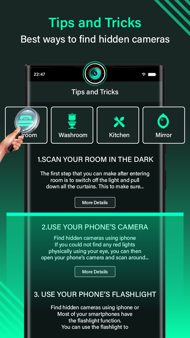 Introducing Hidden Camera Finder App, the ultimate solution for uncovering hidden cameras and other surveillance devices. With advanced detection capabilities such as EMF sensors, RF signal scanning, and bug sweeping technology, this user-friendly app ensures your privacy is protected wherever you go. Whether you're at home, in a hotel, or at work, this app is a must-have for anyone seeking peace of mind. While some users have reported mixed experiences, the Hidden Camera Finder App remains a top choice for individuals looking to safeguard their privacy and detect covert surveillance equipment. Download it now and stay one step ahead of potential spies.