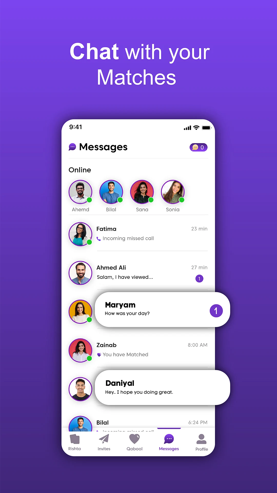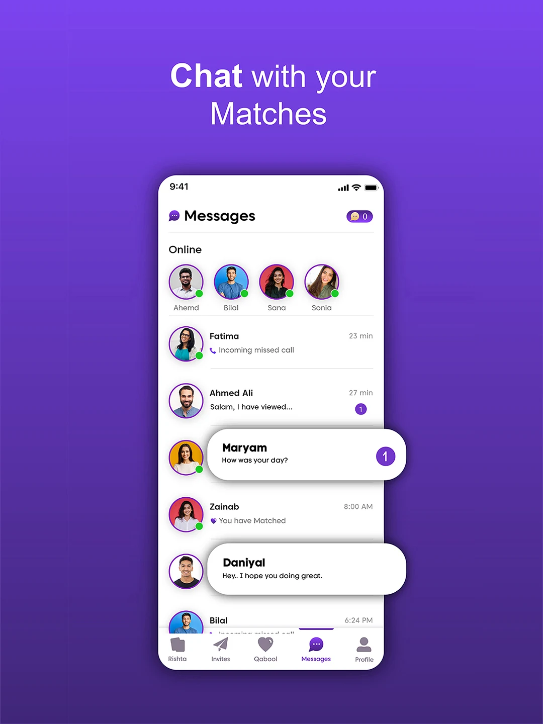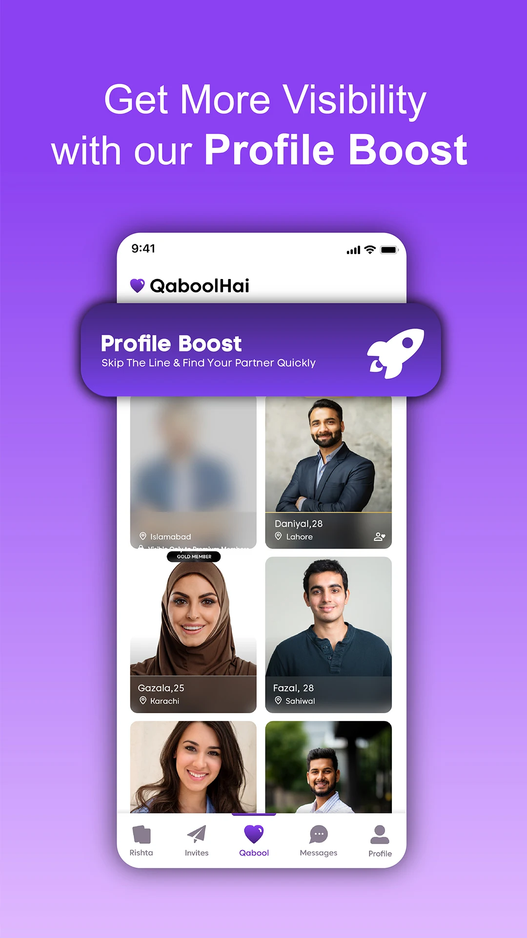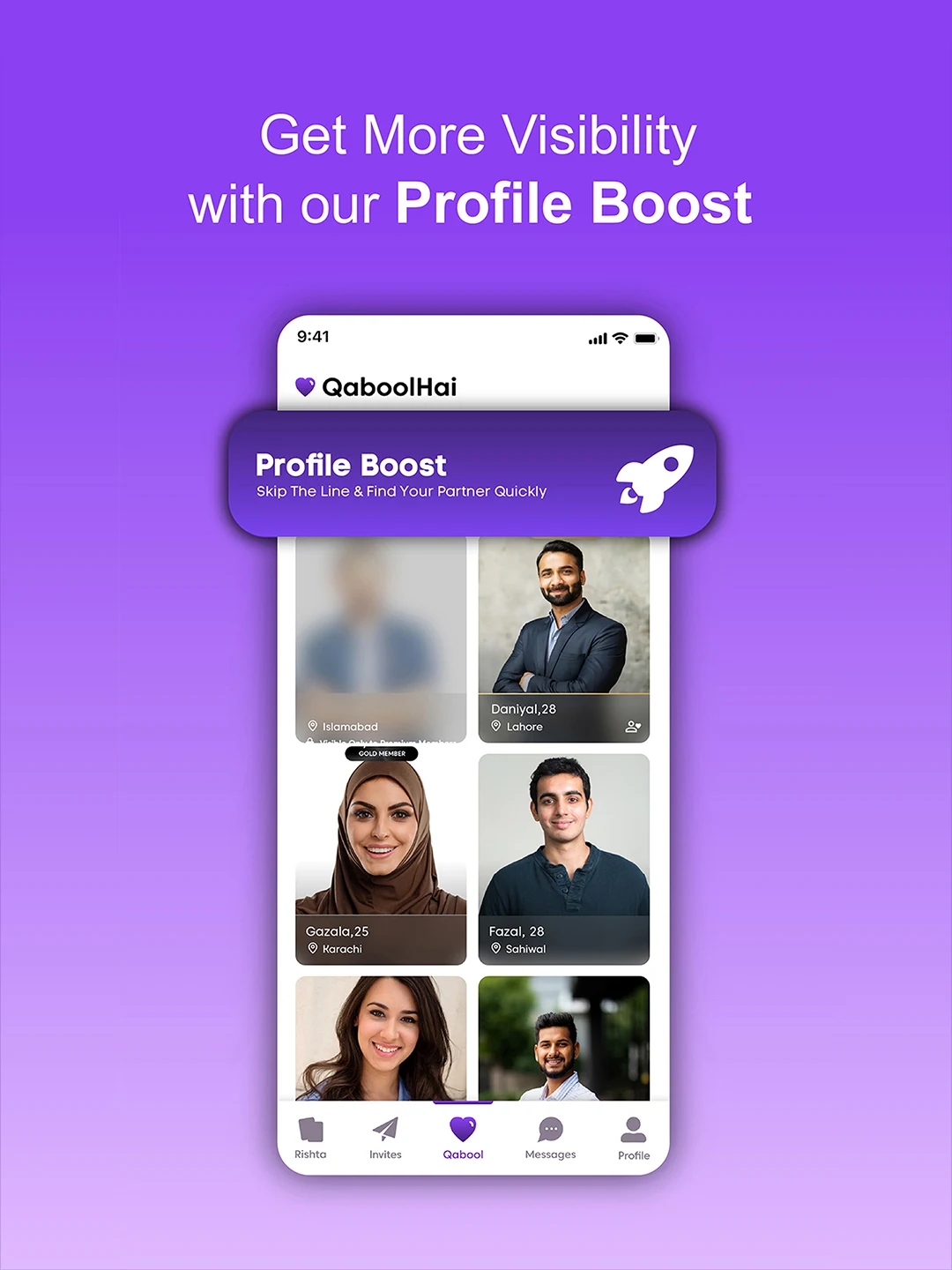 Introducing "QaboolHai," the premier halal matchmaking platform for individuals seeking a life partner. Our mission is to modernize the matchmaking process in South Asia while upholding traditional values. Download our app on iOS or Android, create a free account, and begin browsing your matches. With options to invite or pass on profiles, you'll be notified when a match accepts your invite. For personalized matchmaking, consider our QaboolHai Platinum services. Enjoy a complimentary week of unlimited usage after signing up, then explore our Gold Membership for enhanced features. Join us in revolutionizing the way people find love within the bounds of halal principles.