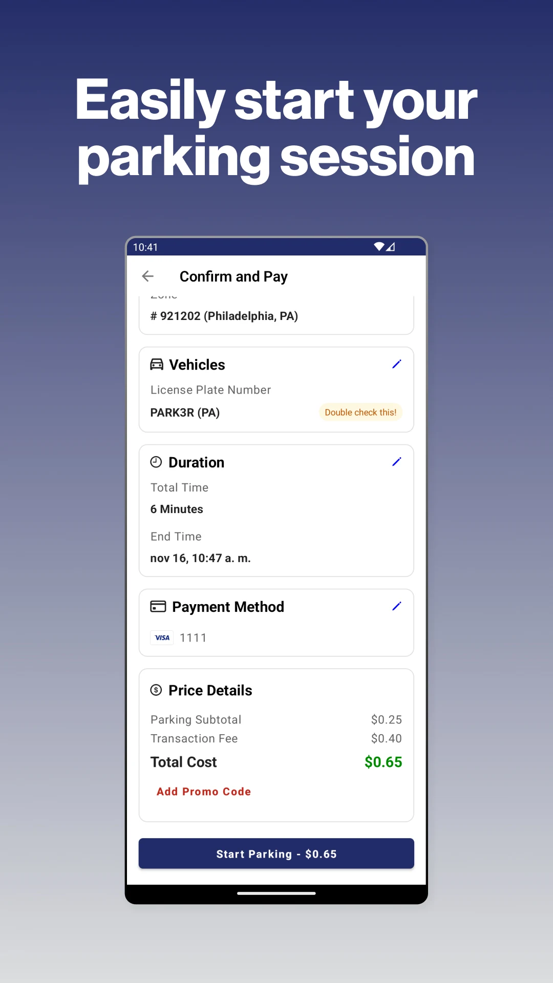 * For on-street and off-street parking, enter the zone number, choose parking duration, and start your session