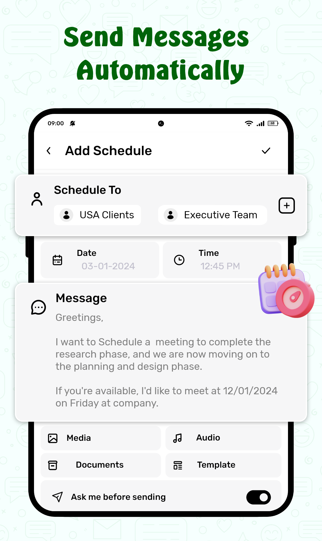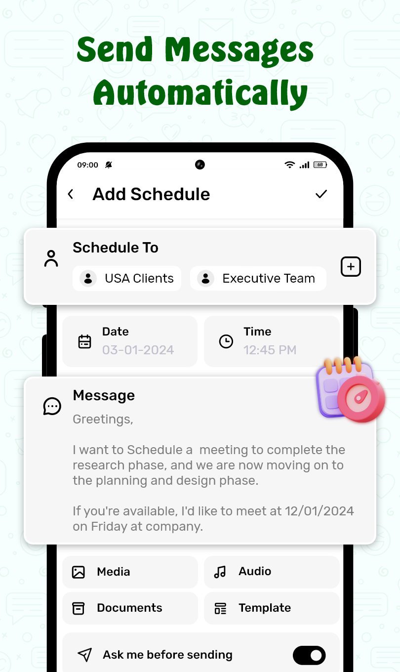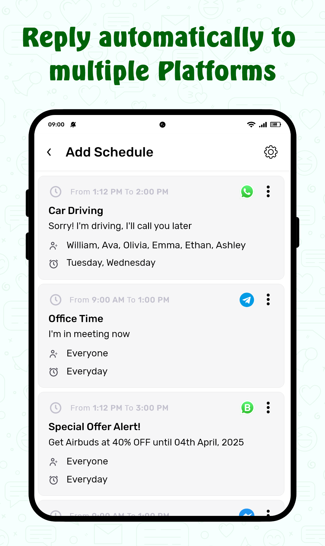 - Auto Text Scheduler for WhatsApp, Telegram, WhatsApp Business, and SMS