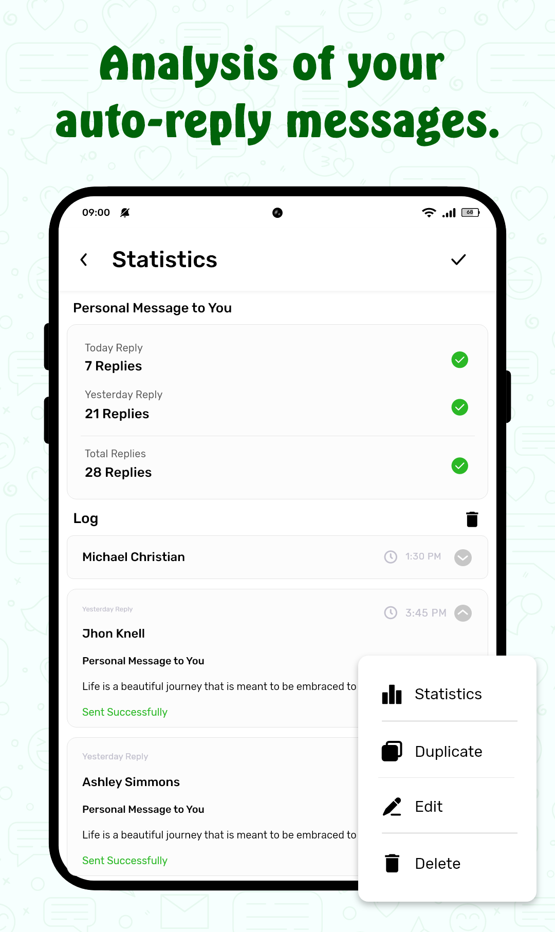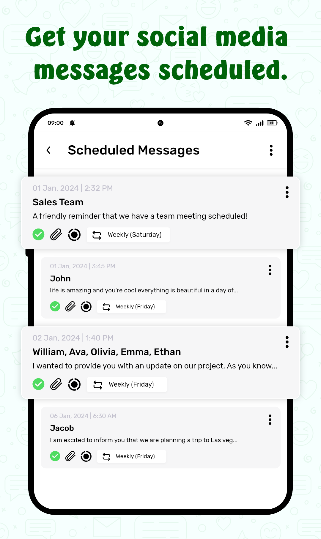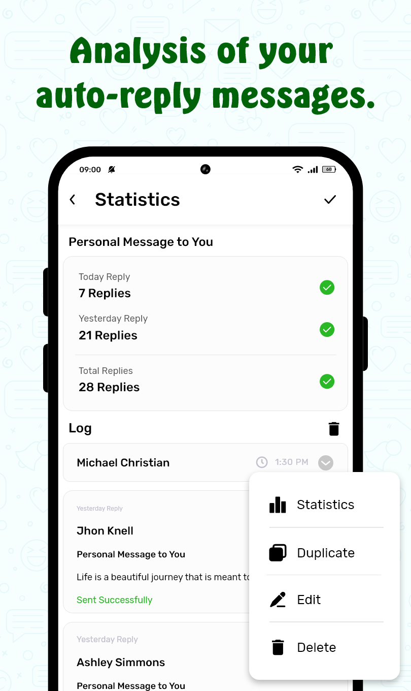 Introducing ScheduleUP: Auto Text Reply, the ultimate tool for automating text messages on WhatsApp, Telegram, WhatsApp Business, and SMS. Easily schedule multiple texts at once and streamline your communication process. With features like auto text scheduling, smart auto responder, and auto reminders, you can efficiently manage your messages and tasks. Whether it's organizing promotional campaigns, sending birthday greetings, or setting reminders for personal activities, ScheduleUP has you covered. Take advantage of templates, media attachments, and group chat replies to enhance your messaging experience. Download ScheduleUP now and discover the convenience of automated messaging.