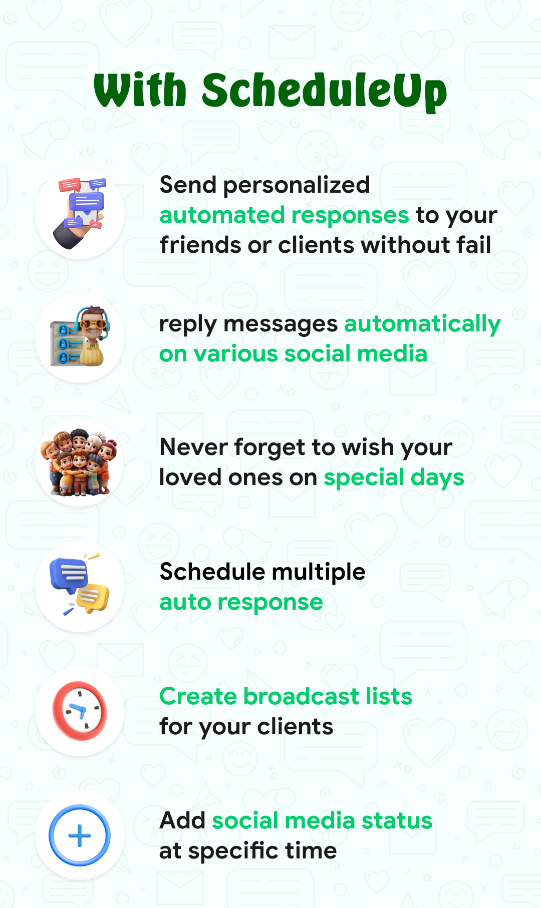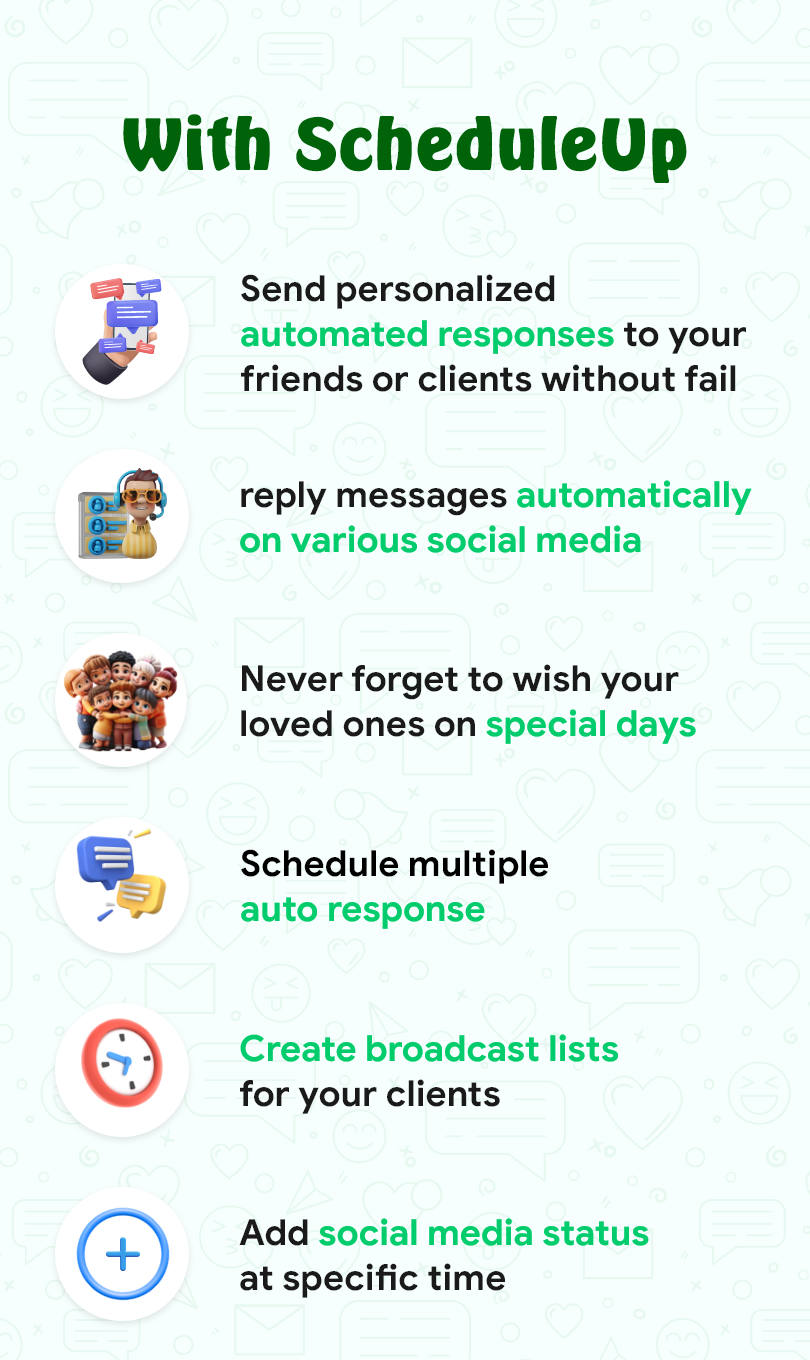 ScheduleUP: Auto Text Reply is the ultimate tool for organizing and automating text messages for WhatsApp, Telegram, WhatsApp Business, and SMS. With features like the Auto Text Scheduler, Smart Auto Responder, and Auto Reminder, users can easily schedule and automate messages for various purposes. Download ScheduleUP now to streamline your messaging and reminder processes.