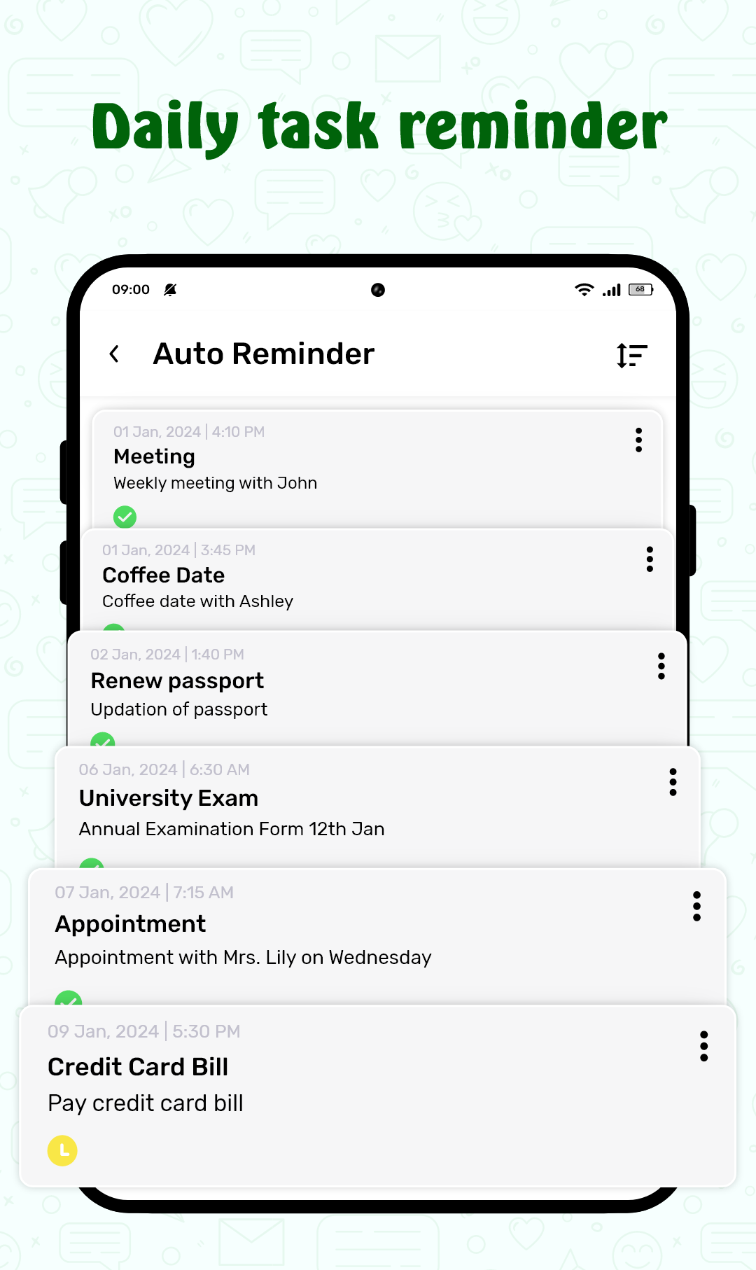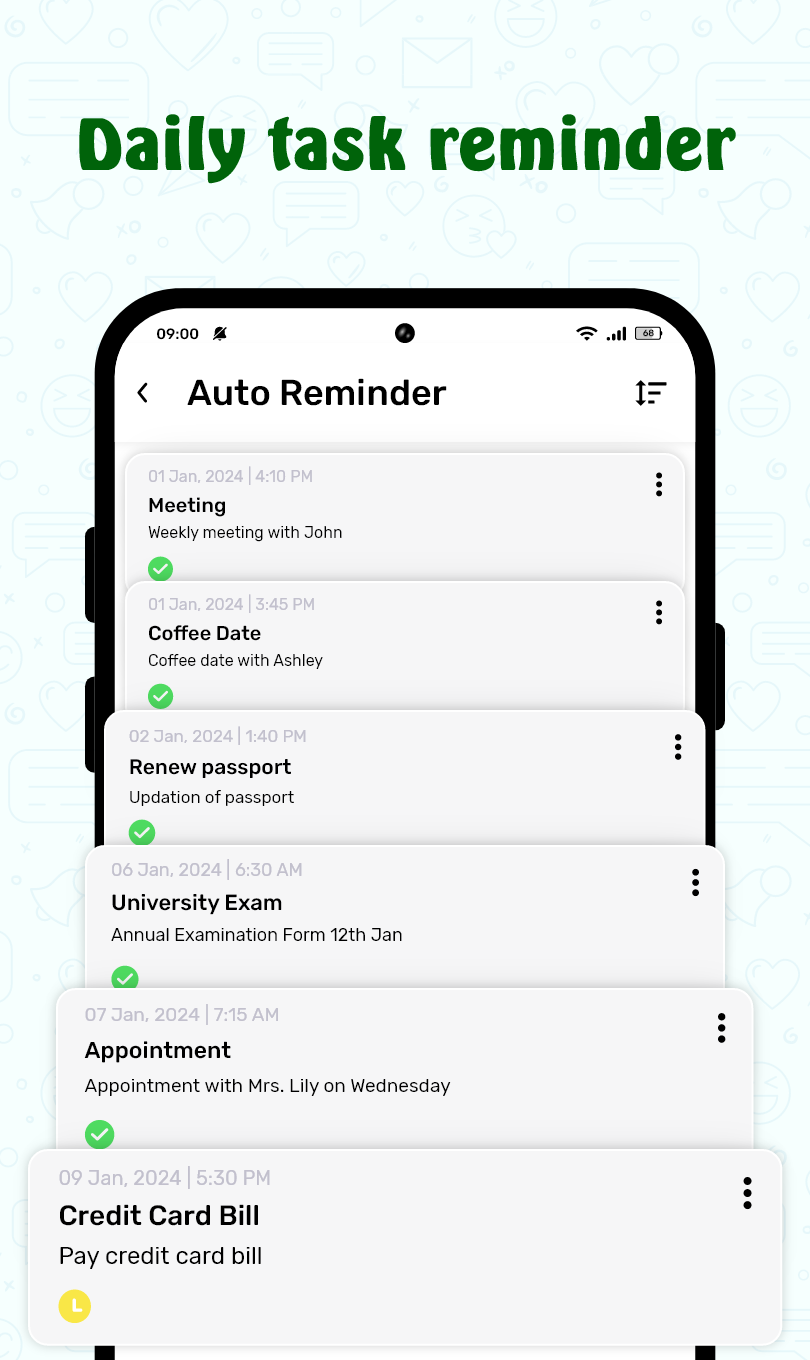 - Auto Reminder for setting reminders for daily activities and message scheduling