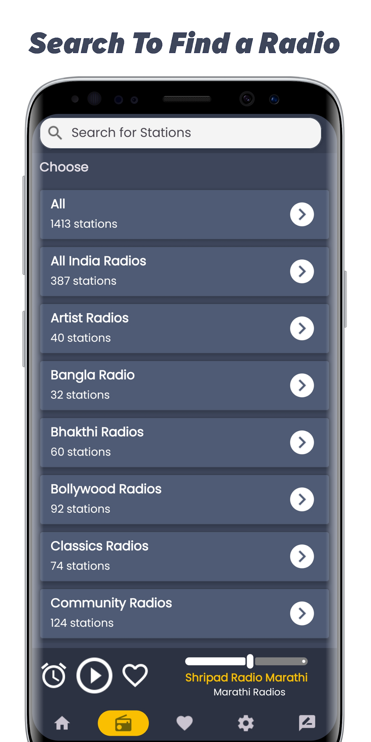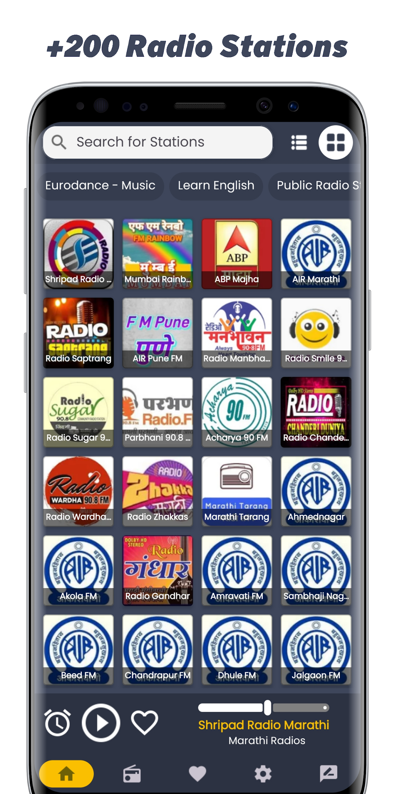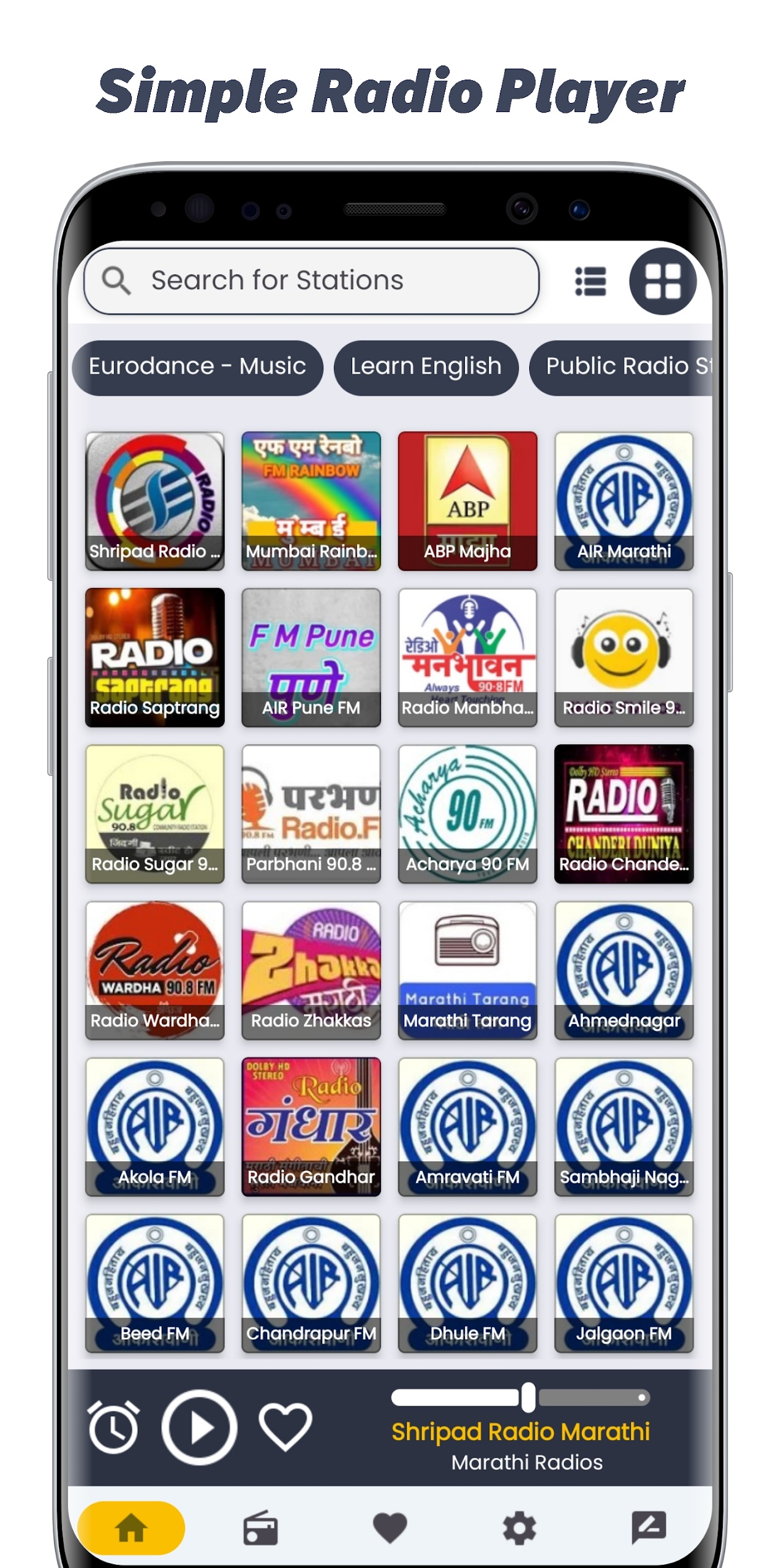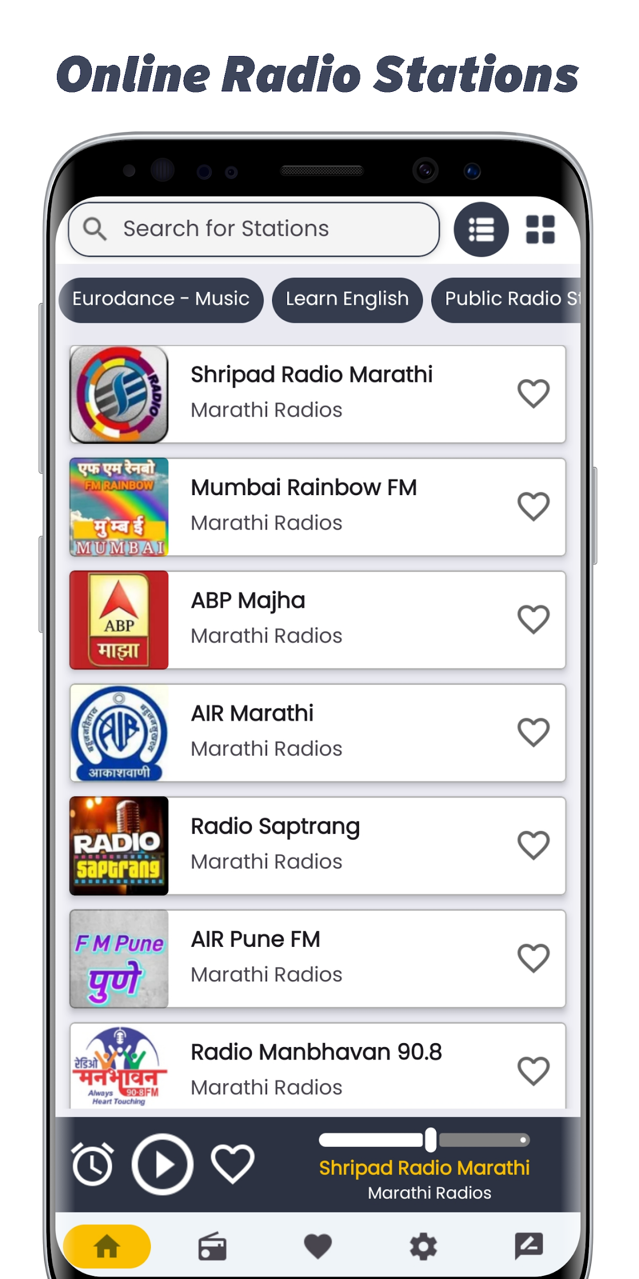 Radiate the essence of Maharashtra with Marathi Radio Stations - your go-to app for tuning in to a diverse range of Marathi FM and online radio channels. Immerse yourself in the rich cultural tapestry of Maharashtra through music, bhajans, news, and more, streamed seamlessly in high quality. With a clean and user-friendly interface, this app offers background audio support, fast streaming, and continuous updates to cater to your ever-evolving preferences. Whether you're at home, on the road, or abroad, keep the spirit of Maharashtra alive with Marathi Radio Stations. Download now and embark on a musical journey anytime, anywhere.