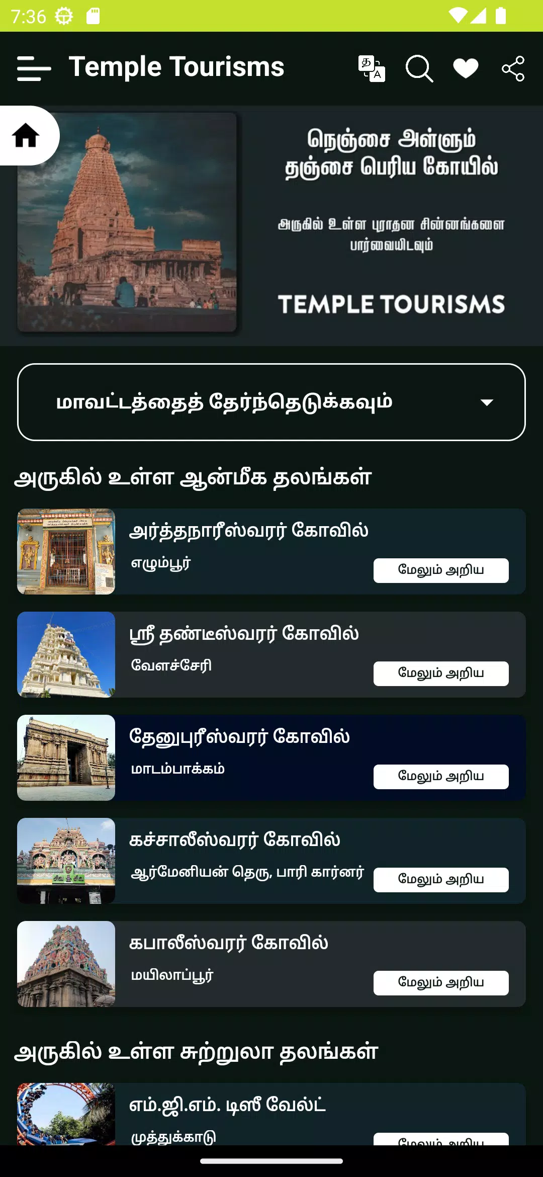 Looking to explore the rich cultural heritage and diverse landscapes of Tamil Nadu? Look no further than Temple Tourisms, your one-stop app for discovering over 10,000 temples and tourist destinations across the region. From spiritual sanctuaries to adrenaline-pumping adventure spots, tranquil eco destinations, and vibrant cultural hotspots, Temple Tourisms has something for every type of traveler. Whether you're seeking a romantic honeymoon getaway or a thrilling jungle adventure, this app has you covered with exclusive tours and expertly curated trip suggestions. Embark on a journey of discovery and immerse yourself in the beauty and wonder of Tamil Nadu with Temple Tourisms.