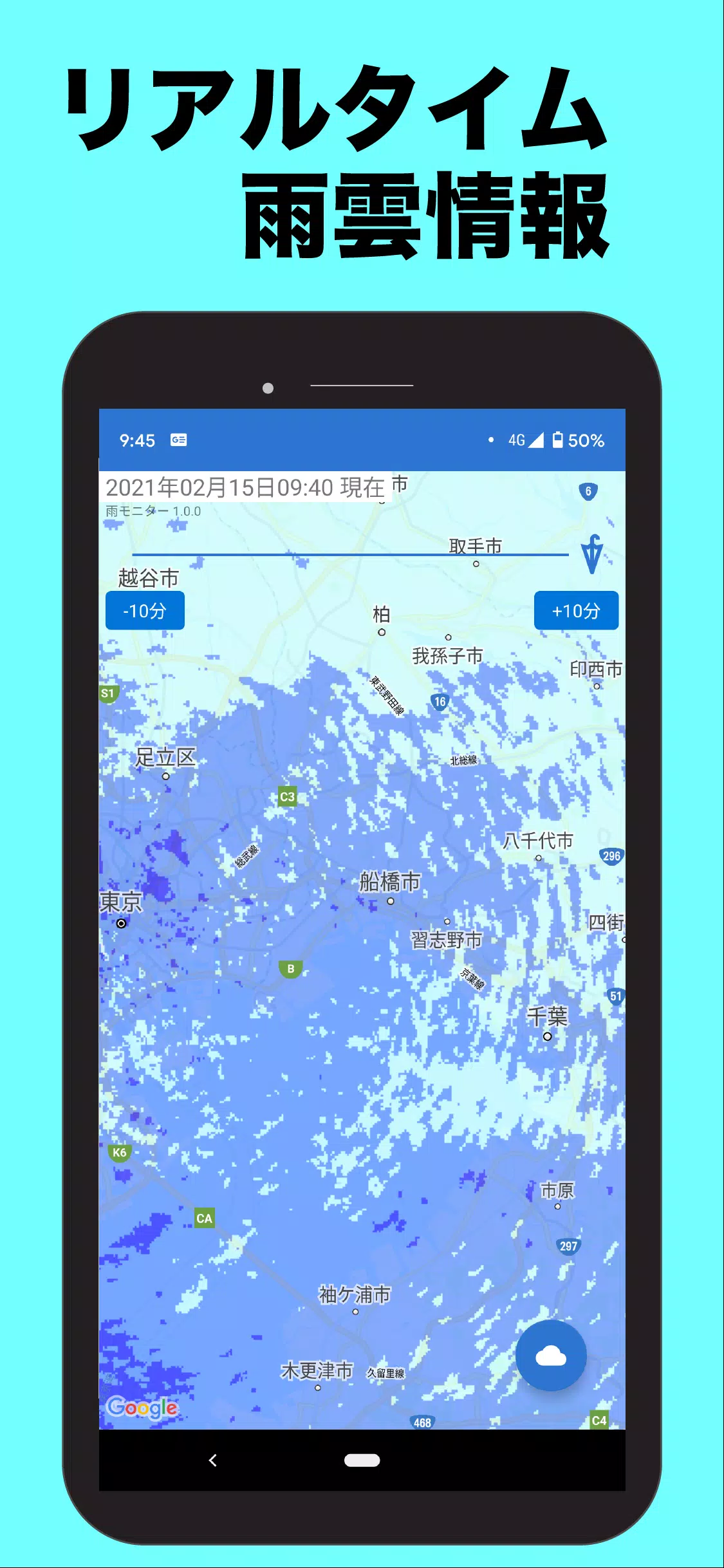 Stay ahead of the rain with 雨モニター, the ultimate rain cloud radar app for the metropolitan area. By displaying Tokyo Amesh's rain cloud data on Google Map, this app allows you to easily track the rainfall status in the city with 10-minute updates up to 100 minutes in the past. Whether you're planning a commute, a picnic, or simply want to stay dry, 雨モニター has got you covered. Don't get caught in a downpour again – download the app today and stay informed in real-time about the weather conditions in Tokyo.