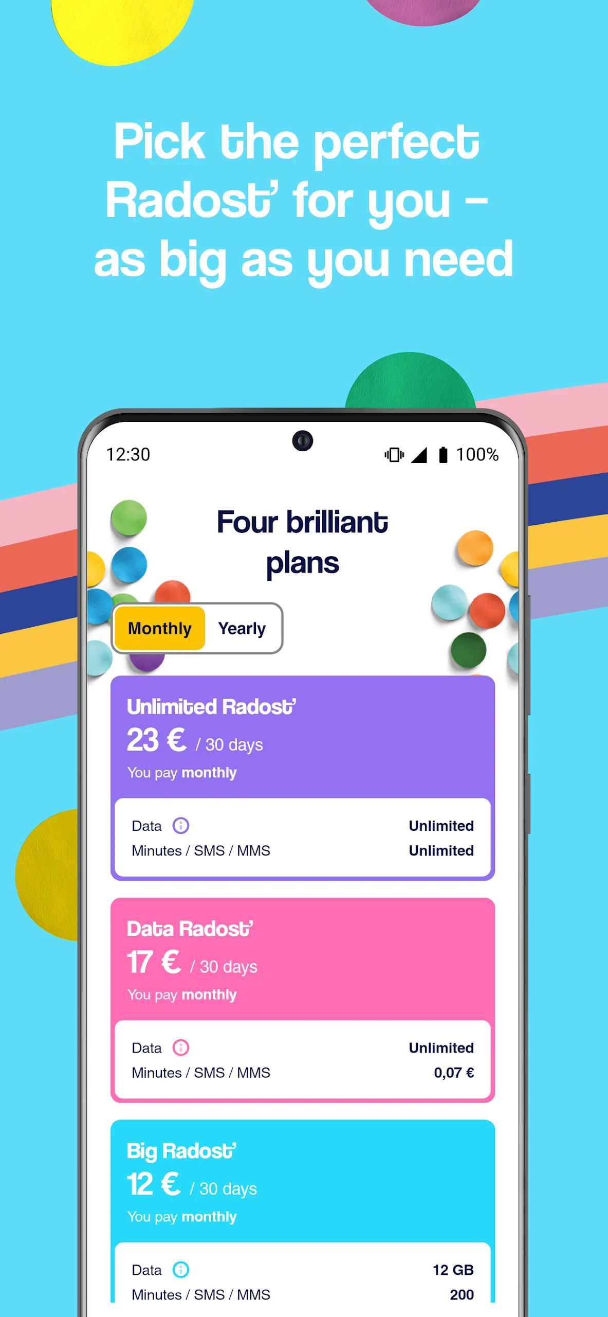 Say goodbye to complicated contracts and endless paperwork with Radosť - the digital in-app service that brings joy to your life! With the convenience of the O2 network, you can easily choose from four fantastic plans, all without any commitments. Set up your account with your credit or debit card and ID, and enjoy the first week free of charge. Plus, with automatic payments and easy plan adjustments, you can tailor your experience to fit your needs and budget. Let Radosť simplify your mobile experience and bring a little more joy into your day - download the app and get started today!