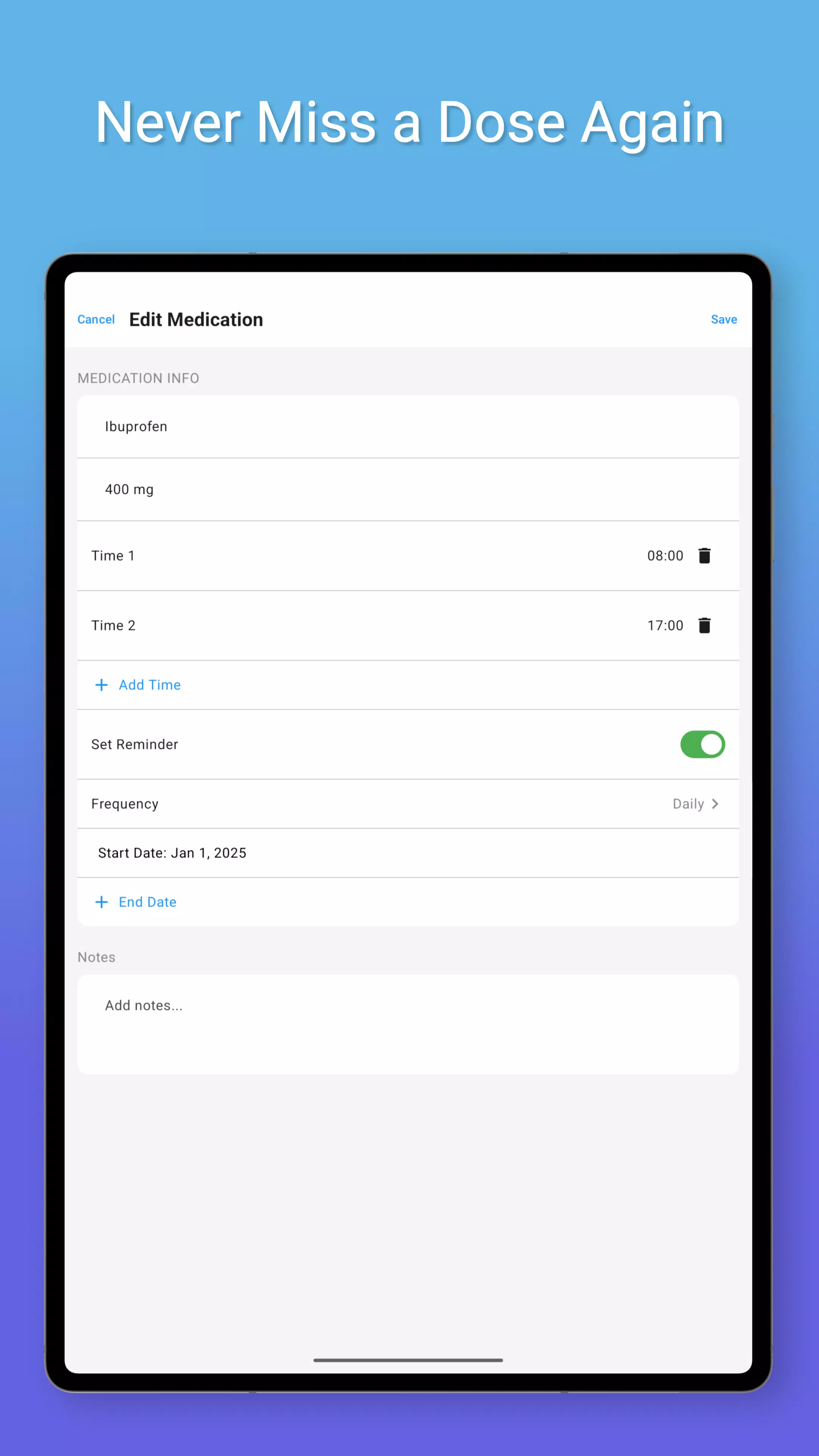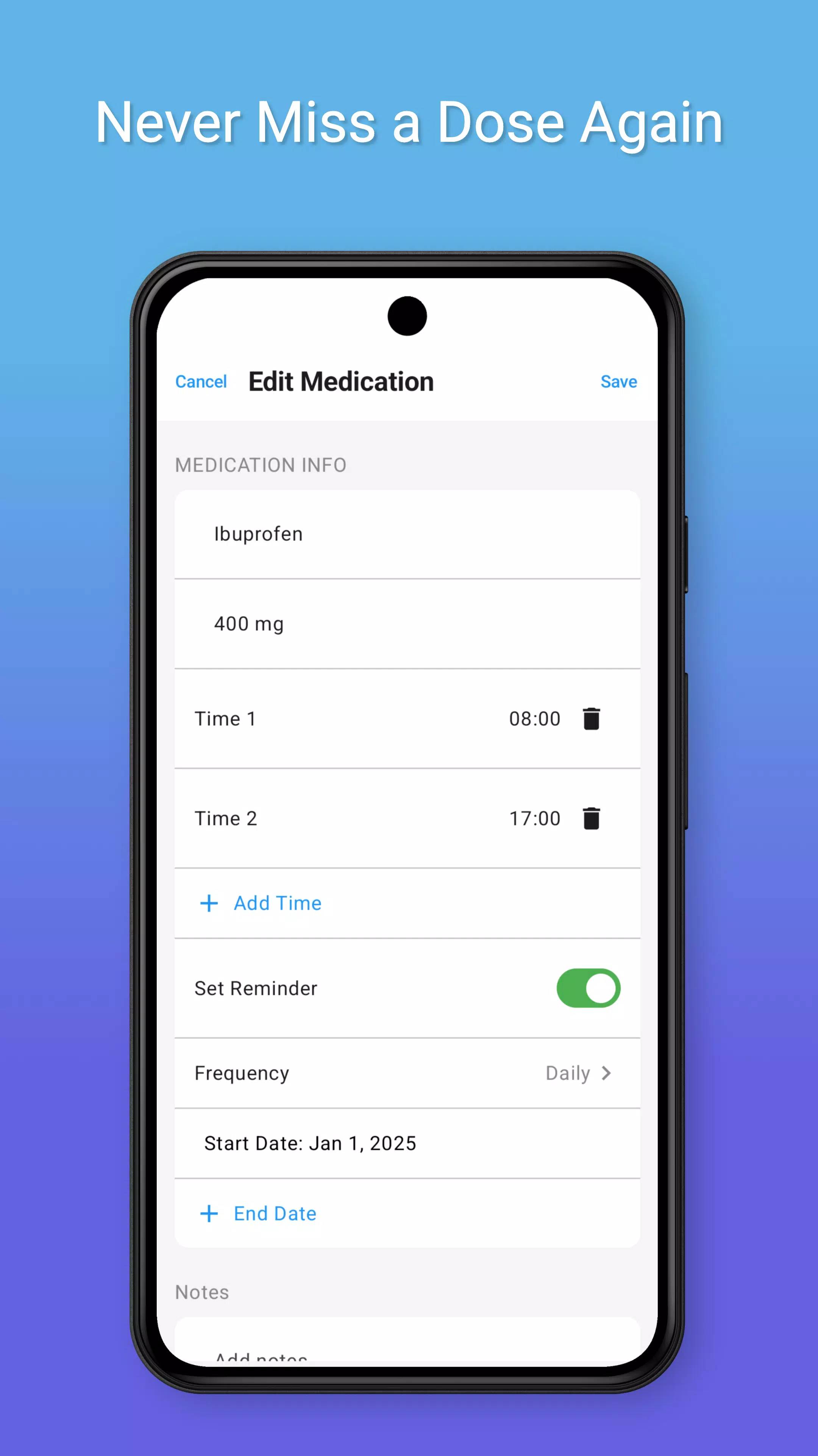> Advanced Scheduling: The app's advanced scheduling feature allows you to manage complex dosing patterns effortlessly. Whether you need to take your medication at irregular intervals, this feature ensures you never miss a dose and stay on top of your health routine.