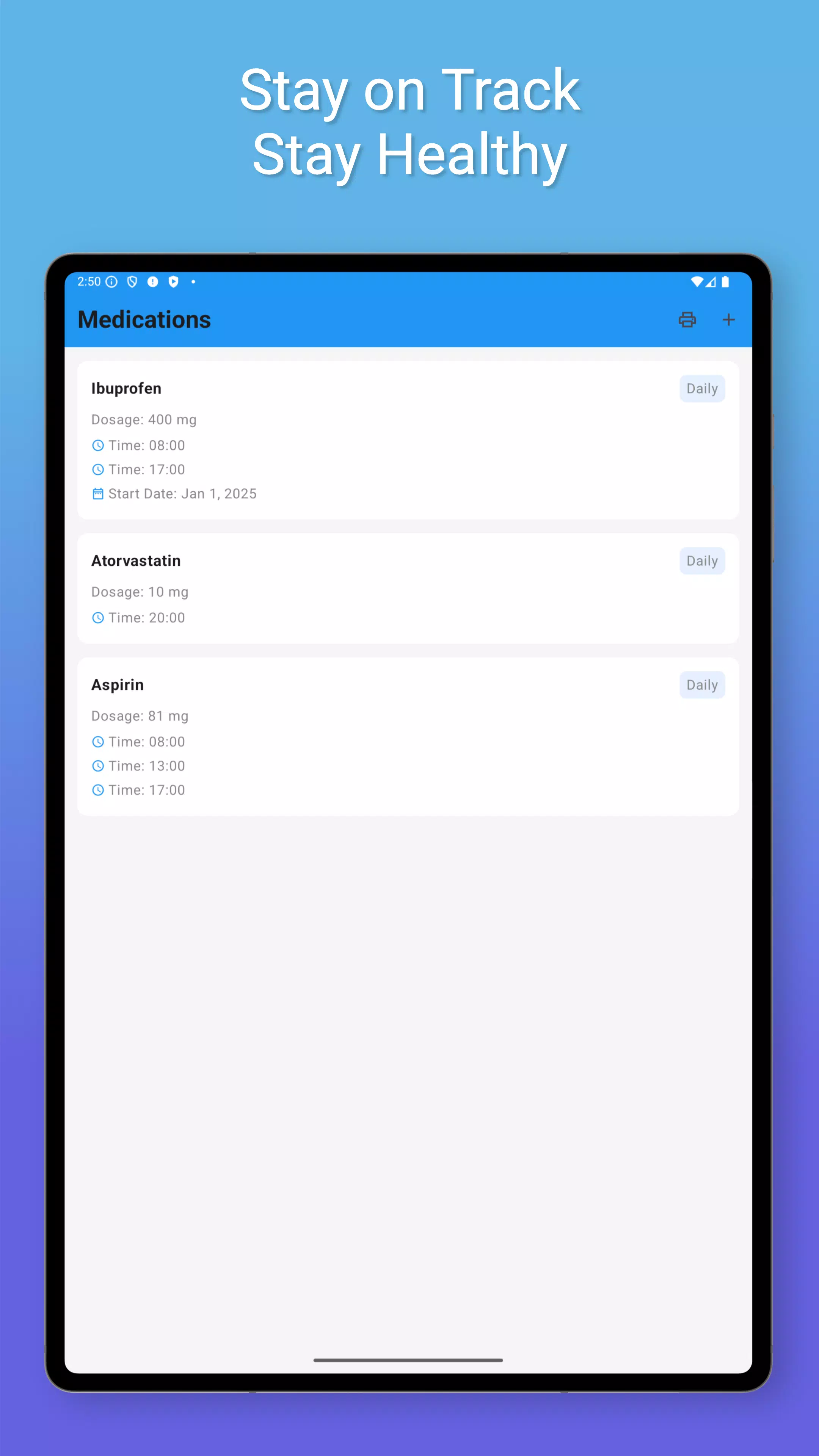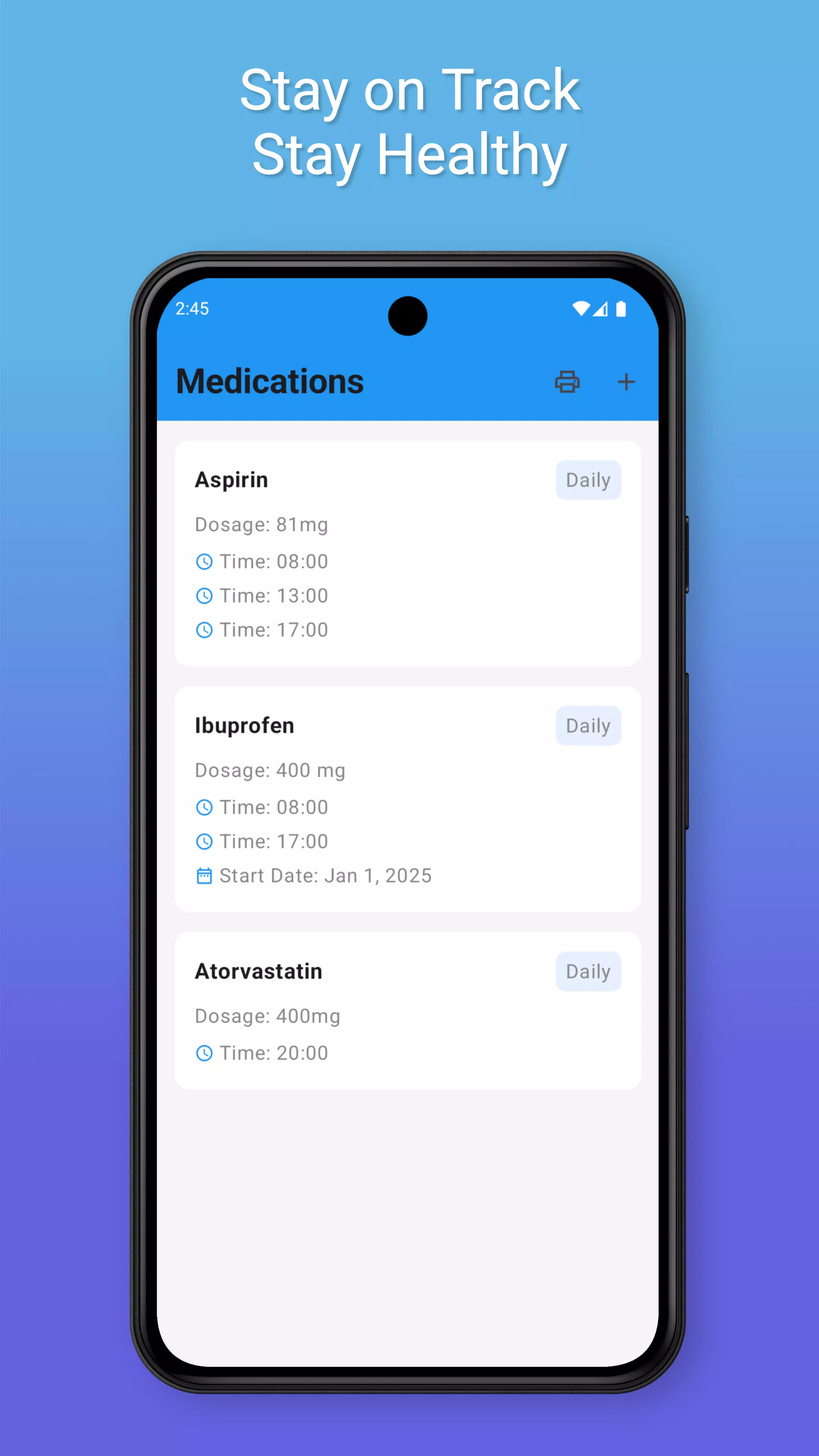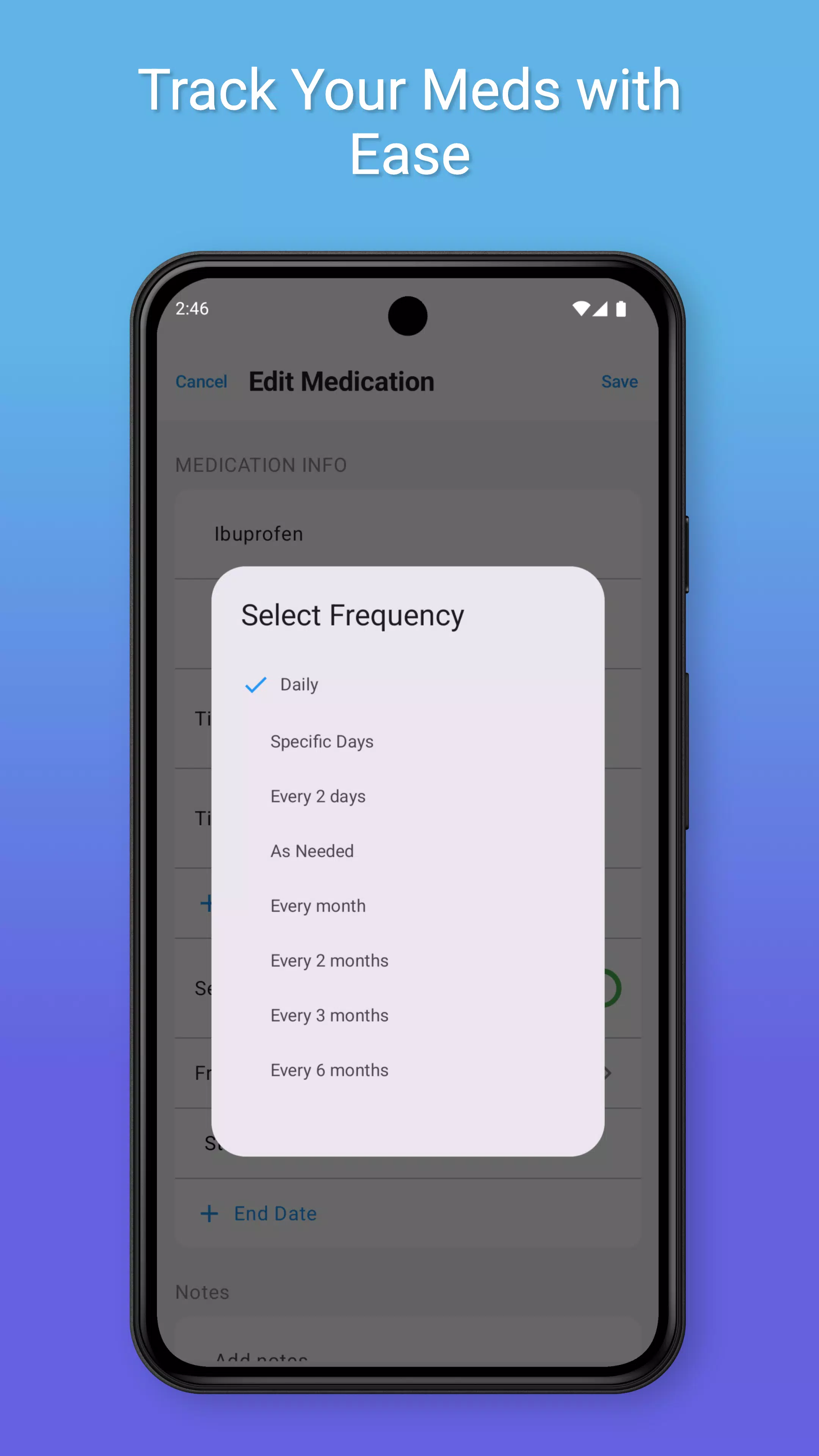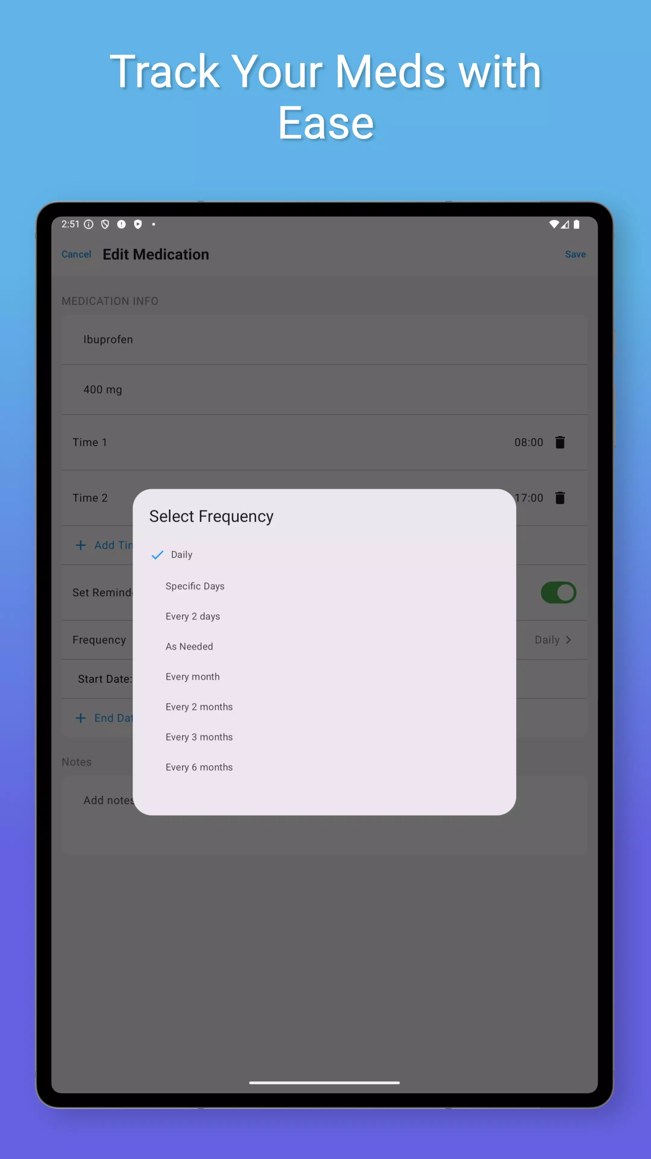 > Set up customized schedules for each medication to ensure you never miss a dose. Choose from daily, weekly, or specific days, and even set multiple reminders per day for added convenience.