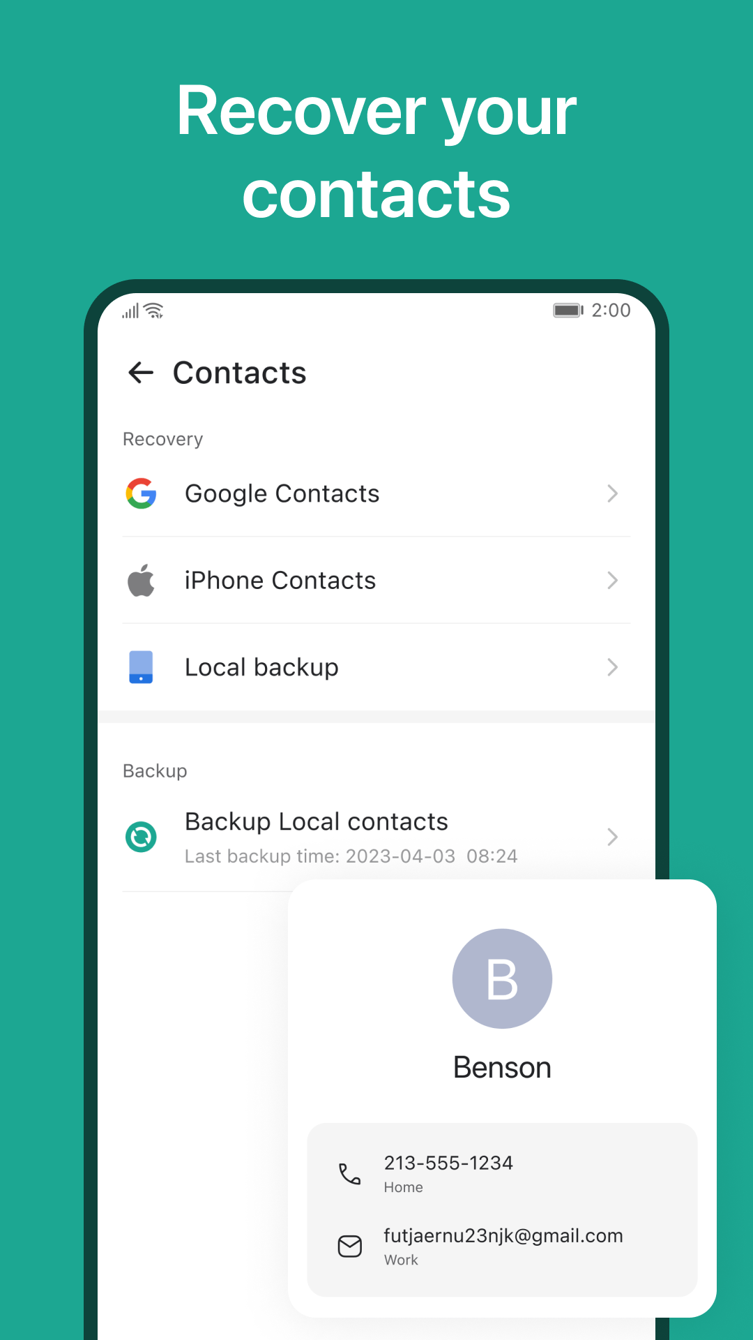 * Contacts Restoration: Easily reconnect with lost contacts from sources like Google Contacts or iPhone Contacts with just one click.