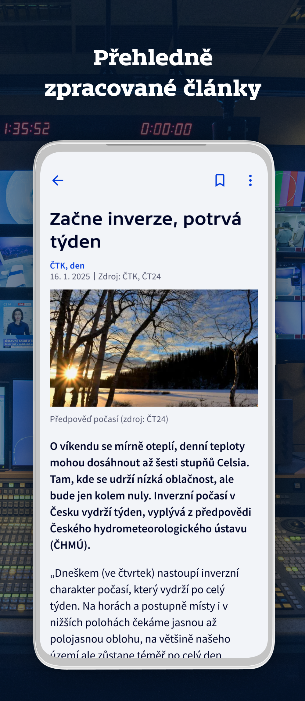 With the ČT24 app, you can stay connected to the latest news and updates wherever you go. Whether you prefer watching live streams, reading articles, or receiving notifications, the app offers a comprehensive news viewing experience tailored to your preferences. Customize the app's appearance, use handy widgets, and share news with ease to enhance your news browsing experience. Download the ČT24 app today and stay informed with the touch of a button.