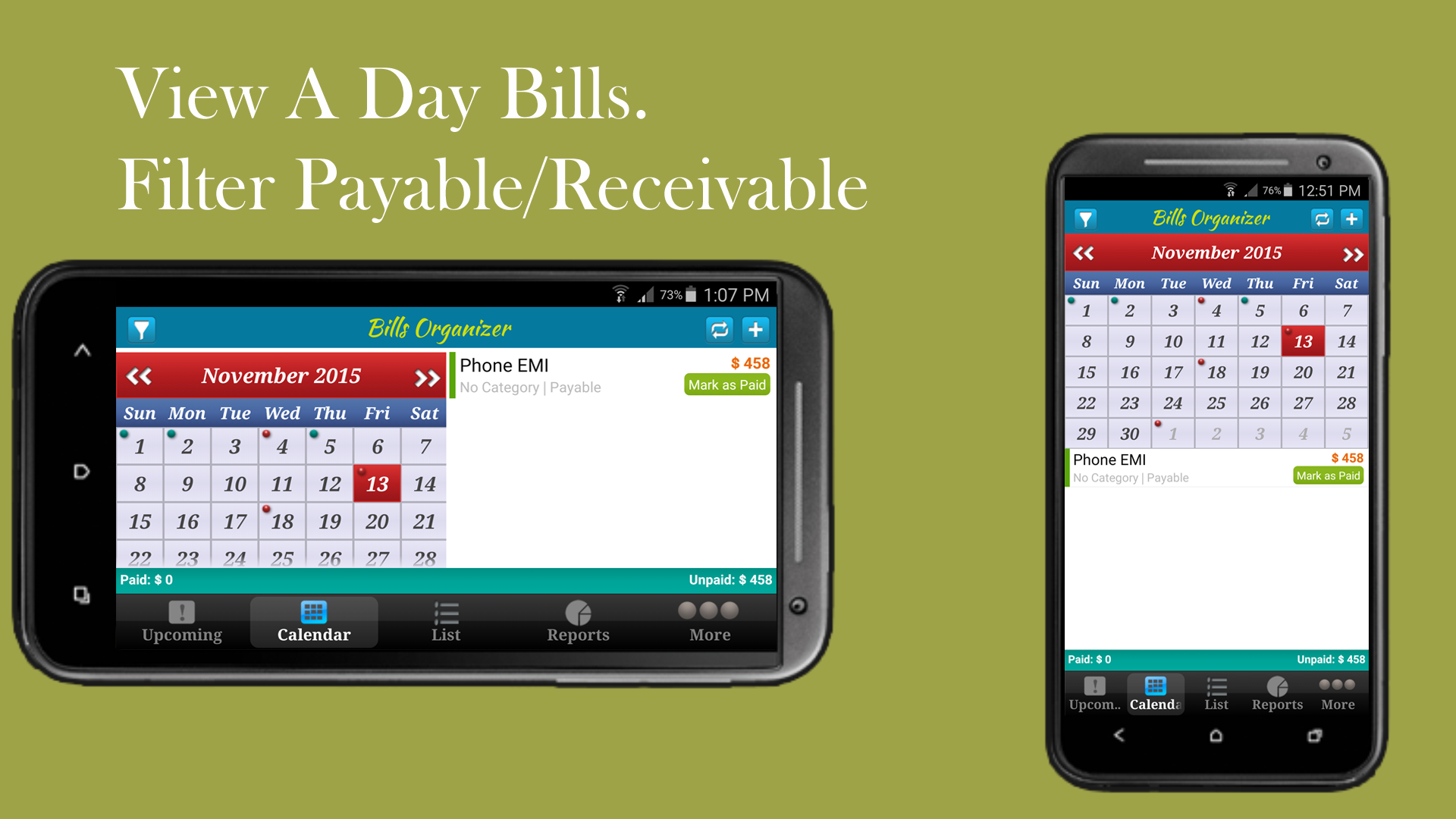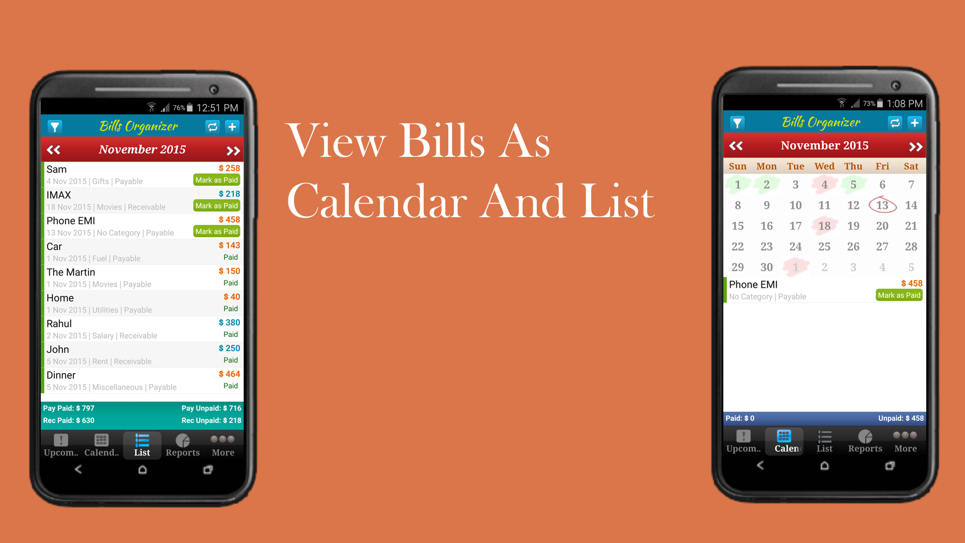 Multiple Viewing Options: With both calendar and list views available, users can choose the layout that best suits their personal finance management style.
