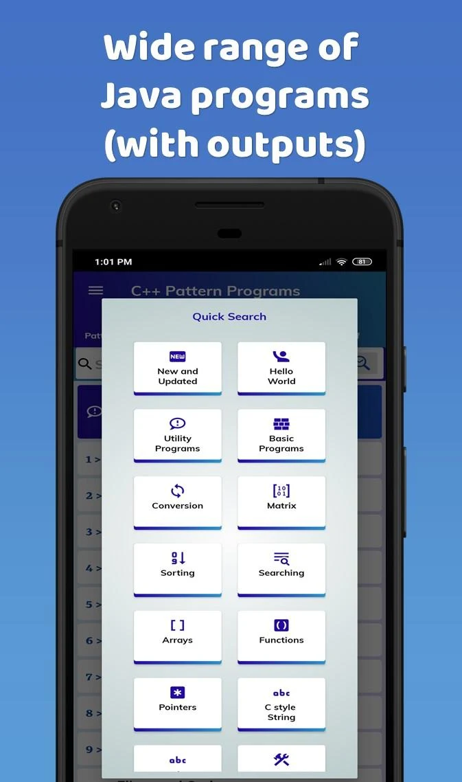 Pattern Programs for Java is a mobile app and learning tool designed to help students and programmers practice Java programming by creating various patterns using loops and logic. The app focuses on building skills in writing code for star patterns, number patterns, alphabet patterns, and more. Pattern Programs for Java provides examples, explanations, and practice exercises to enhance understanding of Java loops, nested loops, and control statements. Users can test their solutions and compare outputs to strengthen programming logic. Overall, Pattern Programs for Java is ideal for beginners and intermediate learners who want to improve coding skills through hands-on practice.