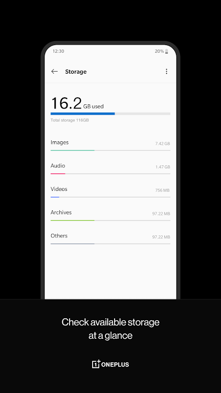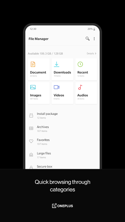 1 OnePlus File Manager allows users to browse and access files by category, including images, videos, documents, and apps.
