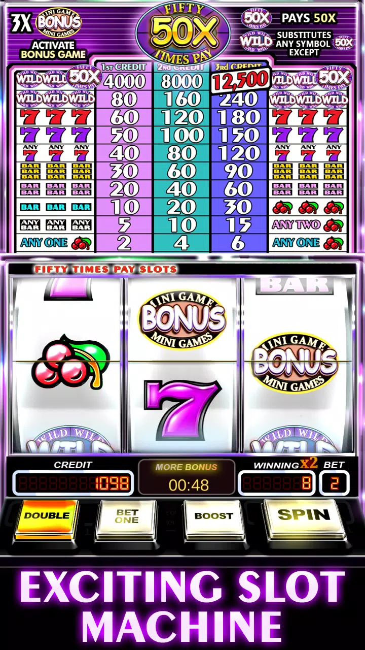 Free Slot Machine 50X Pay Online APK offers an exciting slot gaming experience, highlighted by its powerful 50X pay multiplier and classic slot aesthetics. Whether you’re spinning for fun or chasing big virtual jackpots, this game delivers engaging gameplay, generous bonuses, and the flexibility of offline play. Its APK format allows Android users to enjoy the slots easily and safely. Download it today to experience the thrill of big wins and endless spins!