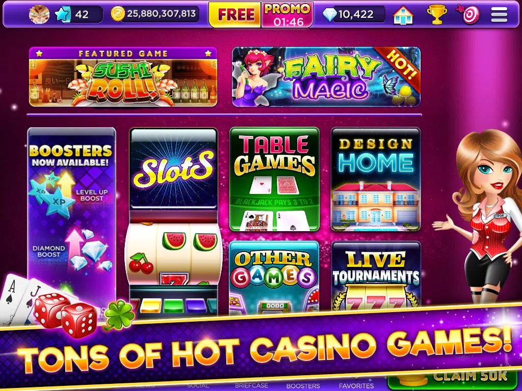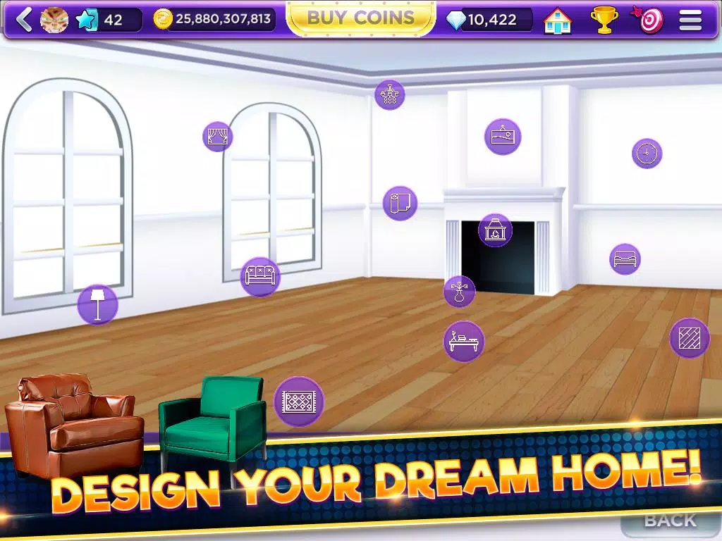 Feature 1 (Unique Combo of Slots and Home Design): Play thrilling slot machines and use your winnings to design stylish rooms and decorate virtual homes.