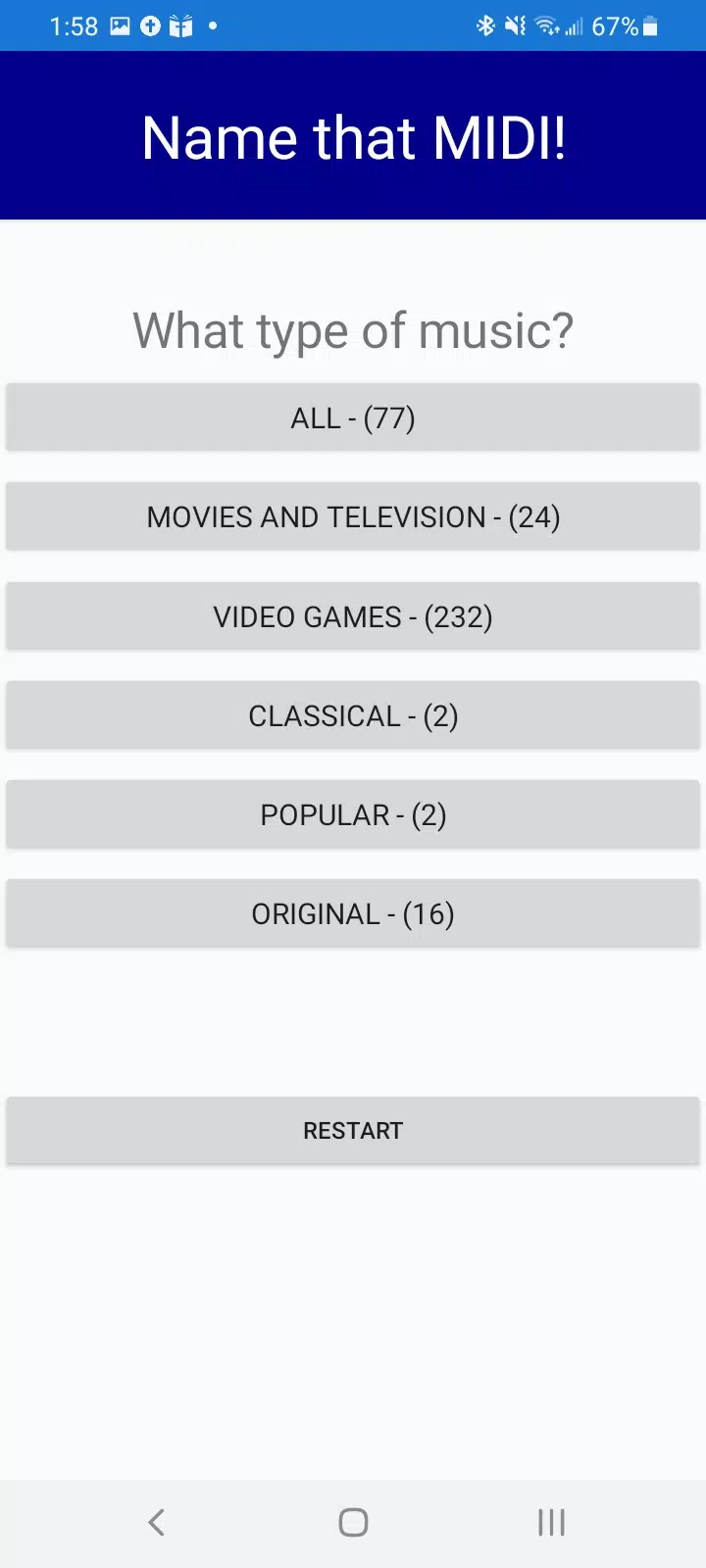 Test your music knowledge with this fun and exciting app that challenges you to name MIDI-type music before your friends or against the clock if you're playing solo. With categories like Movies & Television, Video Games, Classical, Popular, and Original, there's something for everyone to enjoy. Whether you're a music enthusiast or just looking for a good time, this app is perfect for gathering friends or playing on your own. With hundreds of MIDIs to guess from and even more to be added in the future, the fun never ends with Name that MIDI!