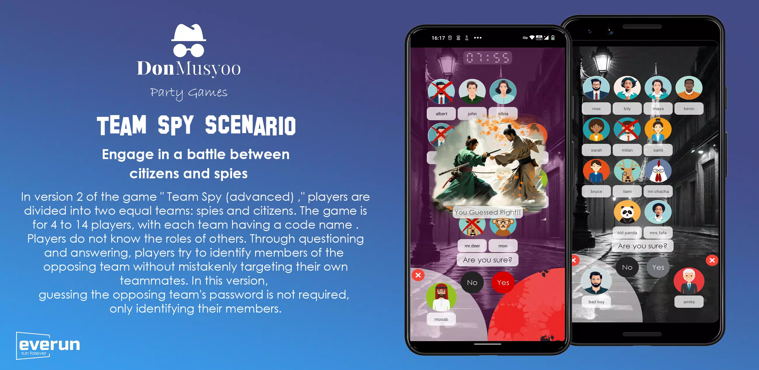 Step into a world of mystery and suspense with our exciting app, Spy Mafia! Get ready to gather your friends and embark on thrilling spy missions with the classic spy game for 3 to 14 players. With unique player profiles and a scoring system to determine the top agents, you'll be on the edge of your seat as you try to uncover the secrets of your opponents. But the fun doesn't stop there - in the advanced "Team Spy" version, teams battle it out to identify their rivals without revealing their own identities. And with the option to play anonymously, the surprises never end. Stay tuned for more updates and surprises - Spy Mafia will keep you hooked!