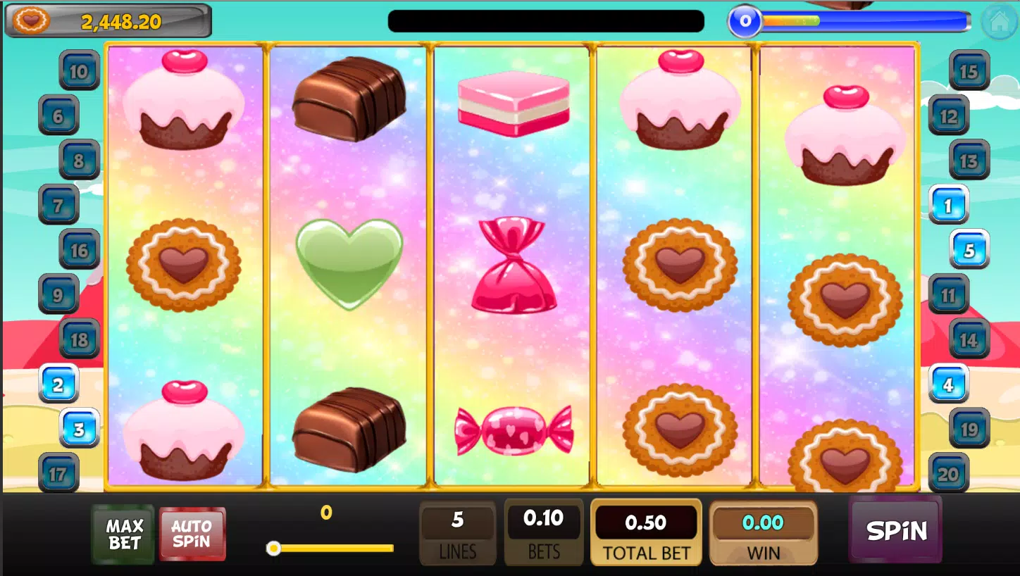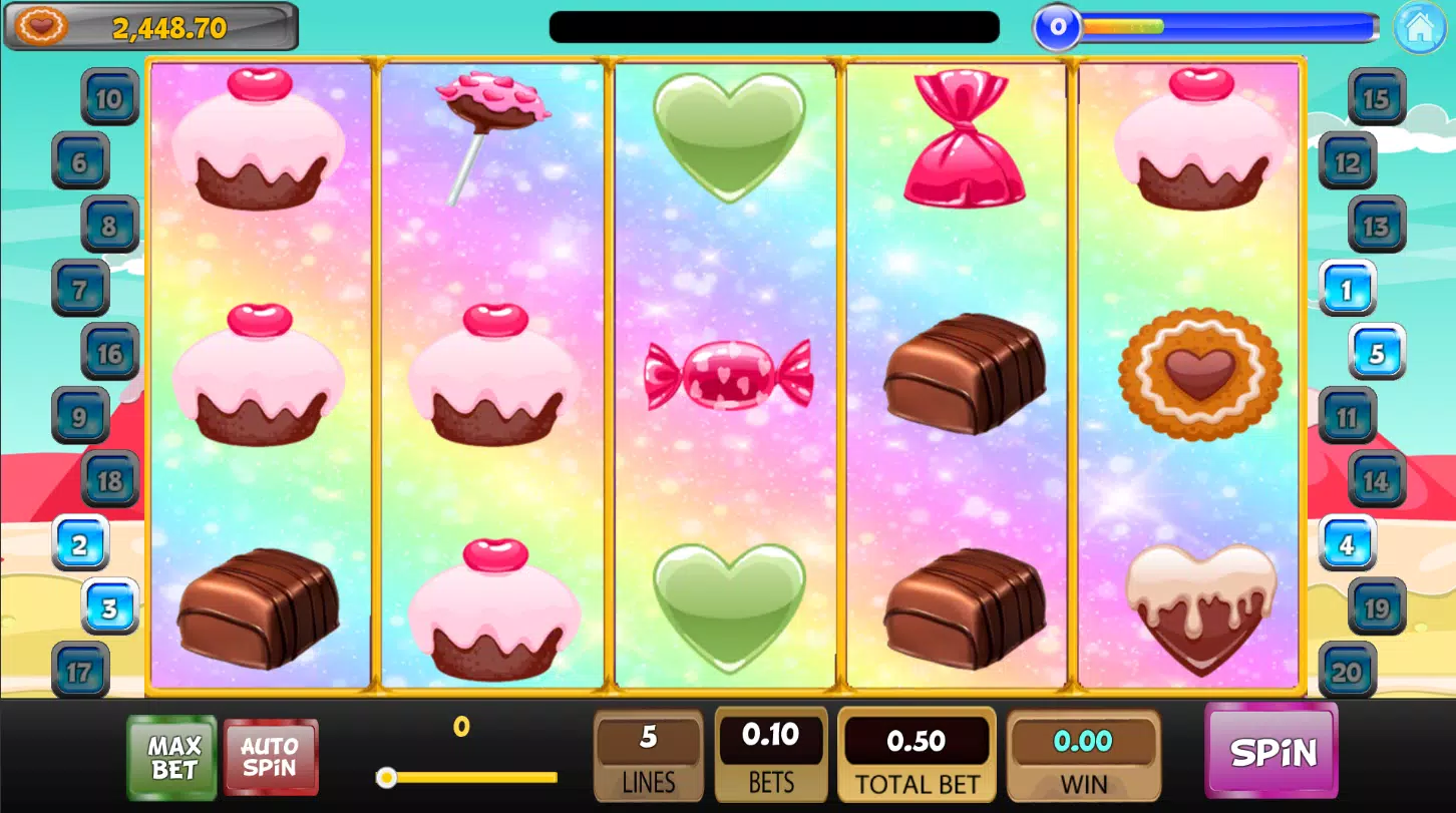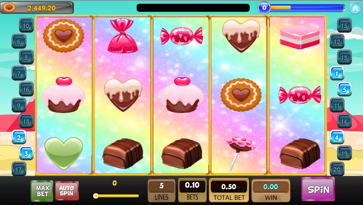 (Features 2) Multiple Slot Machines: Choose from a variety of candy-inspired slot machines, each with unique layouts, paylines, and bonus features.
