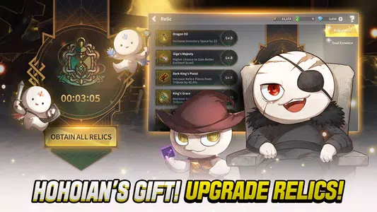 > Tribute to Dark's Village: Upgrade relics to empower your heroes and receive resources from God's Relic to aid in your journey.