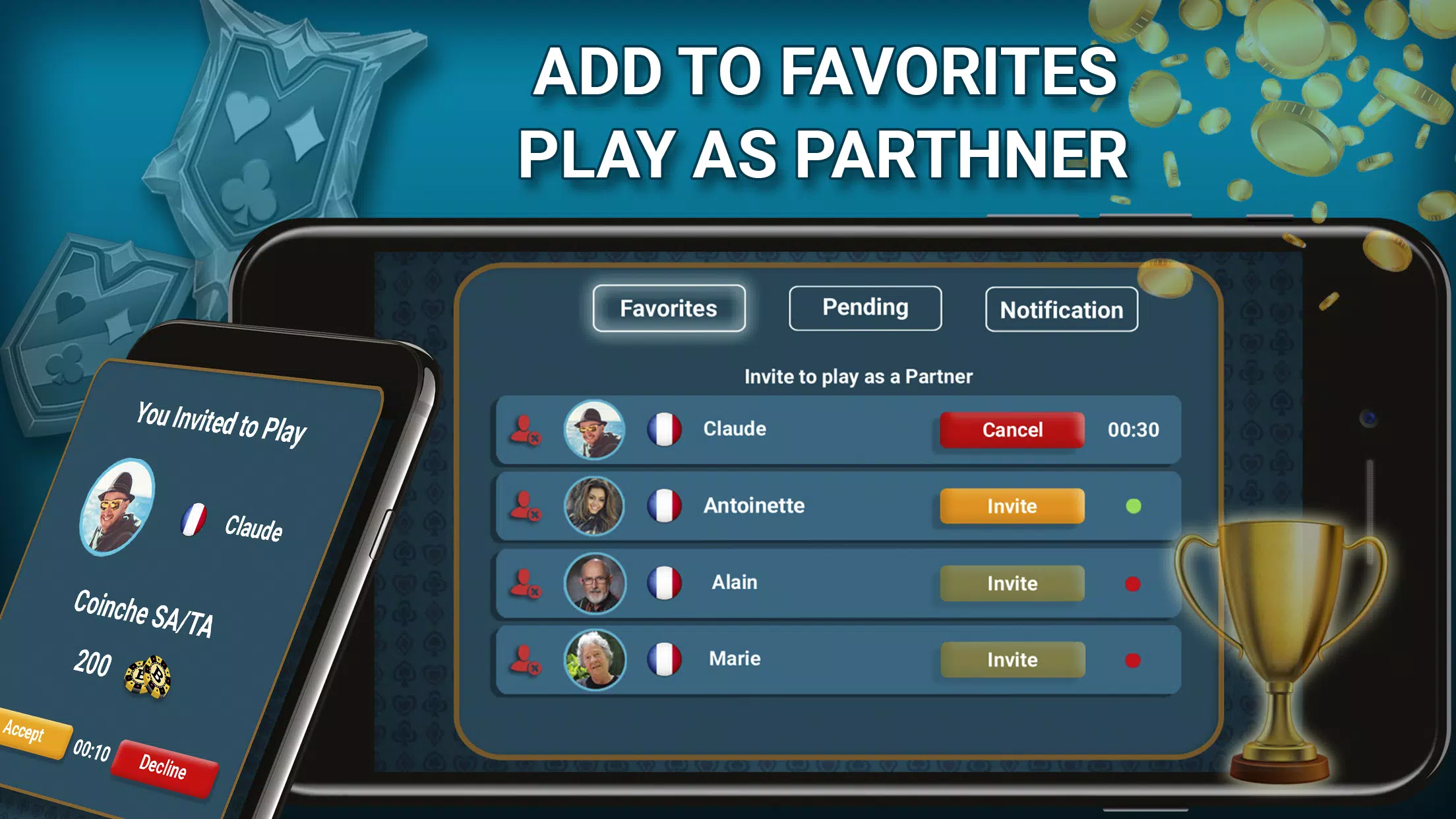 (Features 3) Classic Belote and Coinche Gameplay – Play according to traditional rules, preserving the authentic French card game experience.