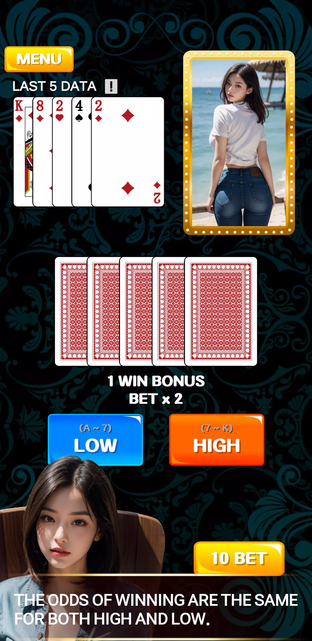 Introducing HighLow- AI Girls Lookbook, a unique mobile application that combines the excitement of a simple game with the beauty of AI-generated female characters. In this game, players choose between High and Low, with the chance to win stunning AI images that will leave you mesmerized. Whether you're a beginner or an experienced player, the rules are easy to understand and the gameplay is addictive. Build your personal gallery of AI beauties and double your earnings for a chance to unlock even more alluring images. Download HighLow- AI Girls Lookbook now and start collecting your favorite AI models today.