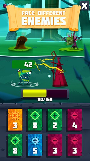 算数的魔法是一款以数字为题材的休闲益智游戏,在游戏中玩家通过翻转牌子完成算数,进而击败对手,这款游戏具有超多关卡和各种不同的敌人,并且每个敌人都有他的特殊能力,这款游戏真的很考验玩家算术能力了,数学不好的慎来!