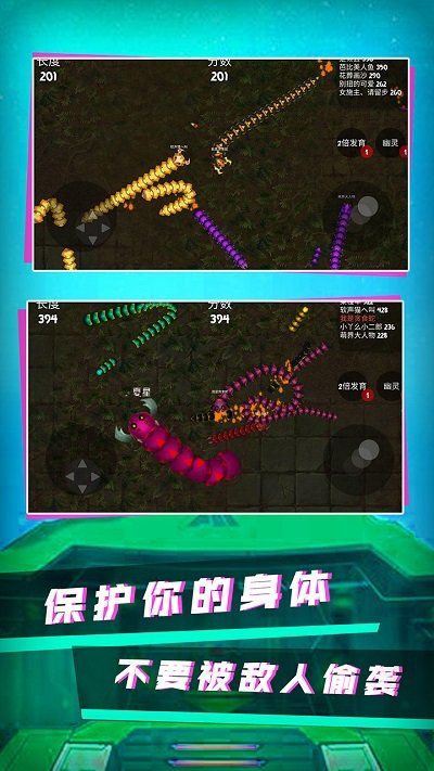 2.多人同场竞技的游戏玩法,玩家们可以对互相吞噬,目标是成为最大的蛇。