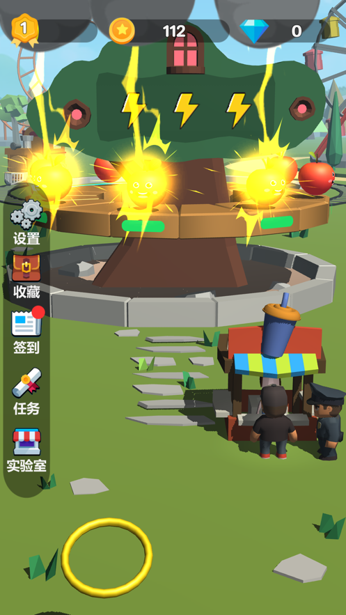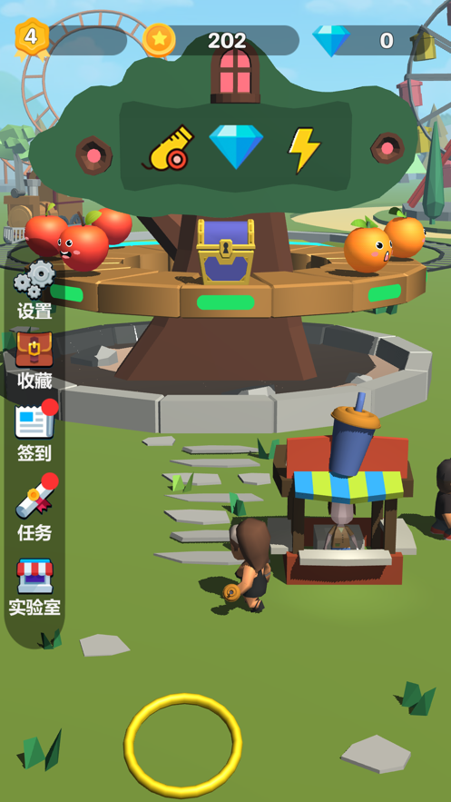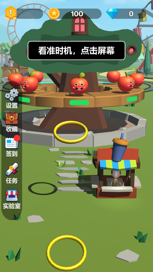 1.卡通风格的游戏画面看起来十分的舒适,玩家需要通过投掷圈圈来圈住苹果;