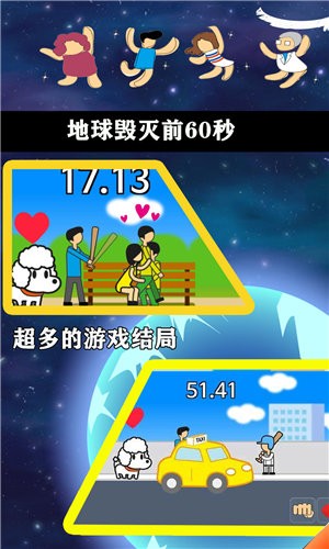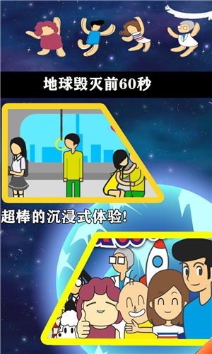 地球毁灭前60秒游戏非常的新颖,采用了开放式的剧情发展,玩家每次在游戏体验的过程当中,选择不同的路径,就会有不一样的结果产生,在地球还有60秒就要毁灭的时候,你需要合理的利用这60秒时间,选择不同的道具,帮助你快速的完成不同的游戏体验感。