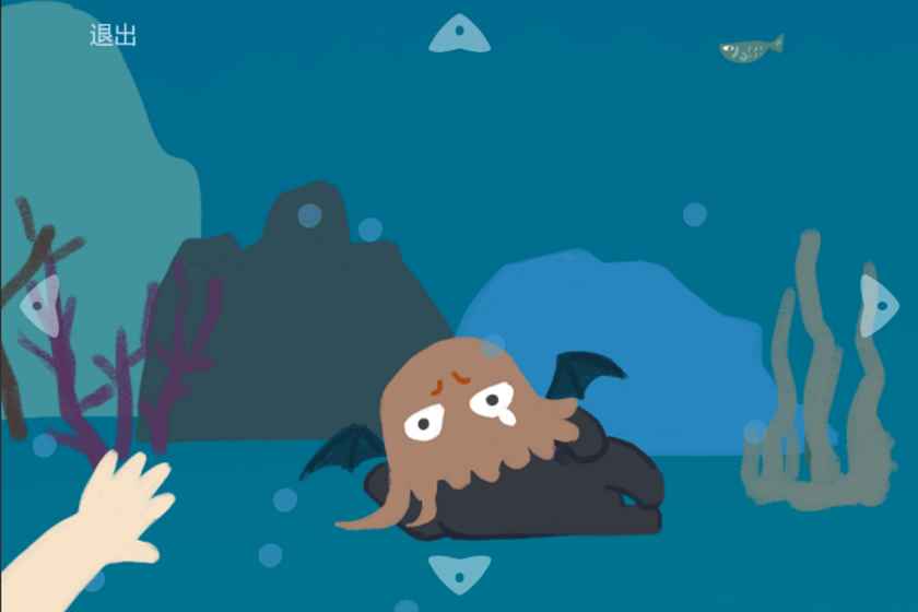游戏画面就是深海,简洁卡通,在这里你需要唤醒沉睡的克苏鲁,寻找海底世界的角落,通过点击各个地方来找到线索解开谜团吧。