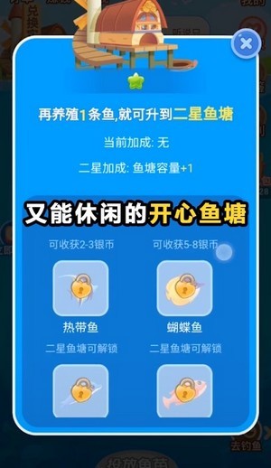 开心鱼塘这是一款非常有趣的休闲益智游戏,在这款游戏里,玩家扮演了一个渔夫,拿着鱼竿在鱼塘里快乐的钓鱼,为了钓到更大的鱼,也是竭尽全力总结了很多的经验,利用各种食物引诱着鱼儿上钩,里面有很多的金币可以兑换更多的资源。