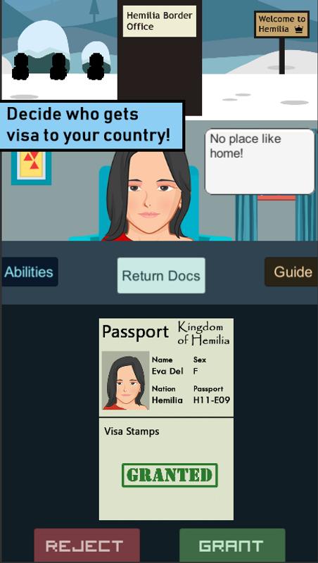 在这个游戏中,你扮演边防哨官,你的工作是给予或拒绝过境旅客的签证!请准备好迎接冒险,在那里遇到所有类型的人并决定信仰,你可能会遇到人试图将所有类型的物品偷运到该国,你的工作是阻止他们并逮捕他们。