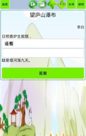 会为玩家提供不一样的古诗,玩家要将空白的地方,正确的补充完整,将正确答案快速的进行提交,会帮助玩家的进行检测,得到自己的真实成绩,不同的古诗词搭配不一样的图画和声音,让孩子在空闲的时候也能学习到更多的内容,老人和小朋友都可以同时来玩耍。