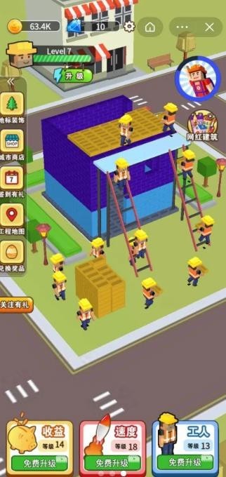 通过自己不断的努力,可以让玩家在游戏中解锁更多的工人,操控着他们在不同的关卡中提升建造速度,让我们完成更多的关卡,获取大量的金币和钻石,这样在困难任务关卡中可以快速完成各种挑战。
