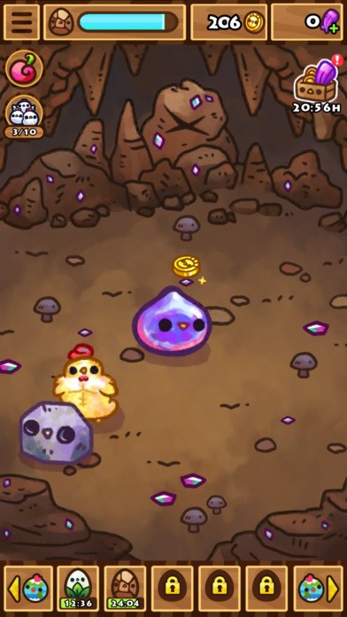 在画面的下方有一排孔位,它们是用来放置并孵化蛋蛋的,也就是说如果这些孔位被占满的话那么就只能对蛋蛋进行处理,可以花费一根紫色羽毛来让其直接孵化,或者是直接卖掉获取10金币。说到紫色羽毛,可以说在这款游戏中它是相当宝贵的,主要可以用来孵化蛋蛋,或者是解锁孔位和新场景等等,要想获得紫色羽毛,要么掏钱购买,要么就使用金币兑换,说实话600金币换一根还是贵了点。