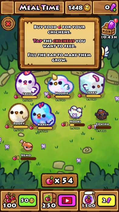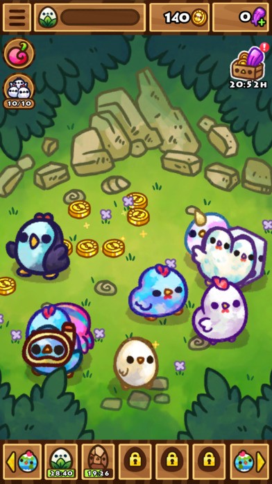 玩家在游戏中要通过不断的点击小鸡来获得经验值,当你屏幕上方的经验槽满了之后,就能得到一颗全新的“鸡蛋”,在经过一段时间的等待,就可以孵化出全新种类的小鸡了。而本作的玩法大体上就是这么个流程,是不是觉得很简单无脑呢。新诞生的小鸡都会被保存到图鉴中,玩家可以随时进行查看,形成了一种收集的乐趣。
