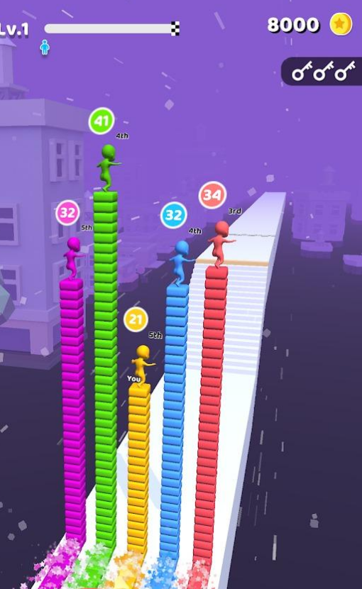 疯狂走楼梯游戏分为不同的类型,需要玩家以多种形式去完成各种挑战,我们可以在游戏中寻找不同的对手与他们发起各种进攻,在挑战之前大家需要收集与自己色彩相同的砖块,这样才可以在疯狂走楼梯中完成各种砖块的搭建。