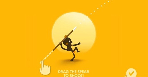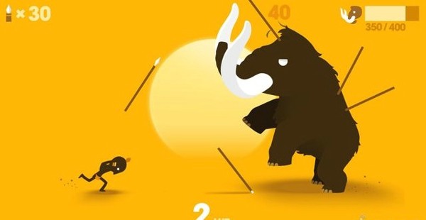 1、游戏开始,玩家只有10杆标枪,游戏目的很简单,在规定的时间内将猛犸象射杀而死。猛犸象会向前向你进行攻击,这时点击左侧屏幕,后退再投标杆。