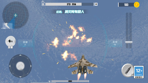 3.采用虚拟双摇杆操作,左手控制转向与翻滚,右手调节高度与瞄准射击,实现全手动空战体验。