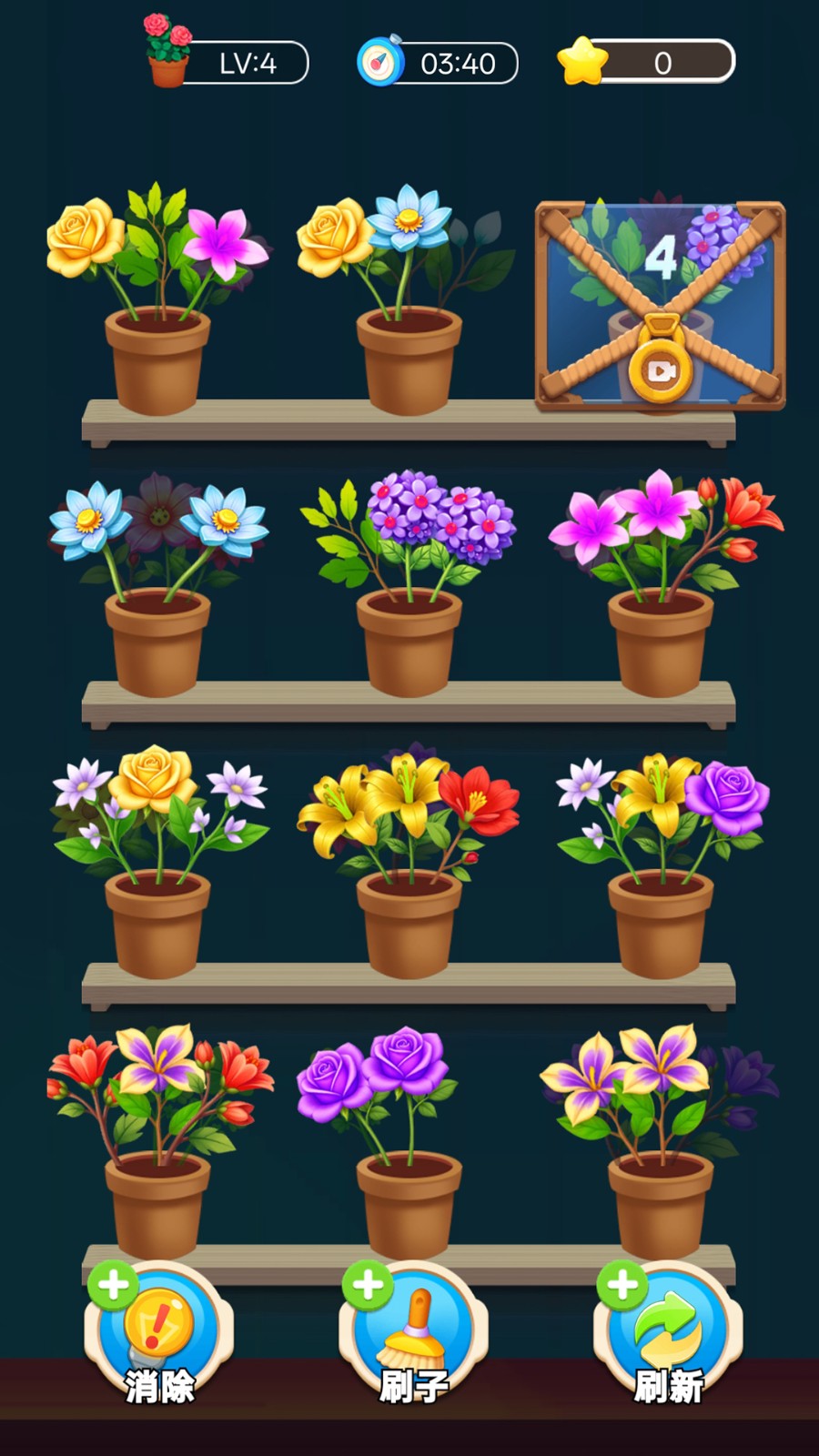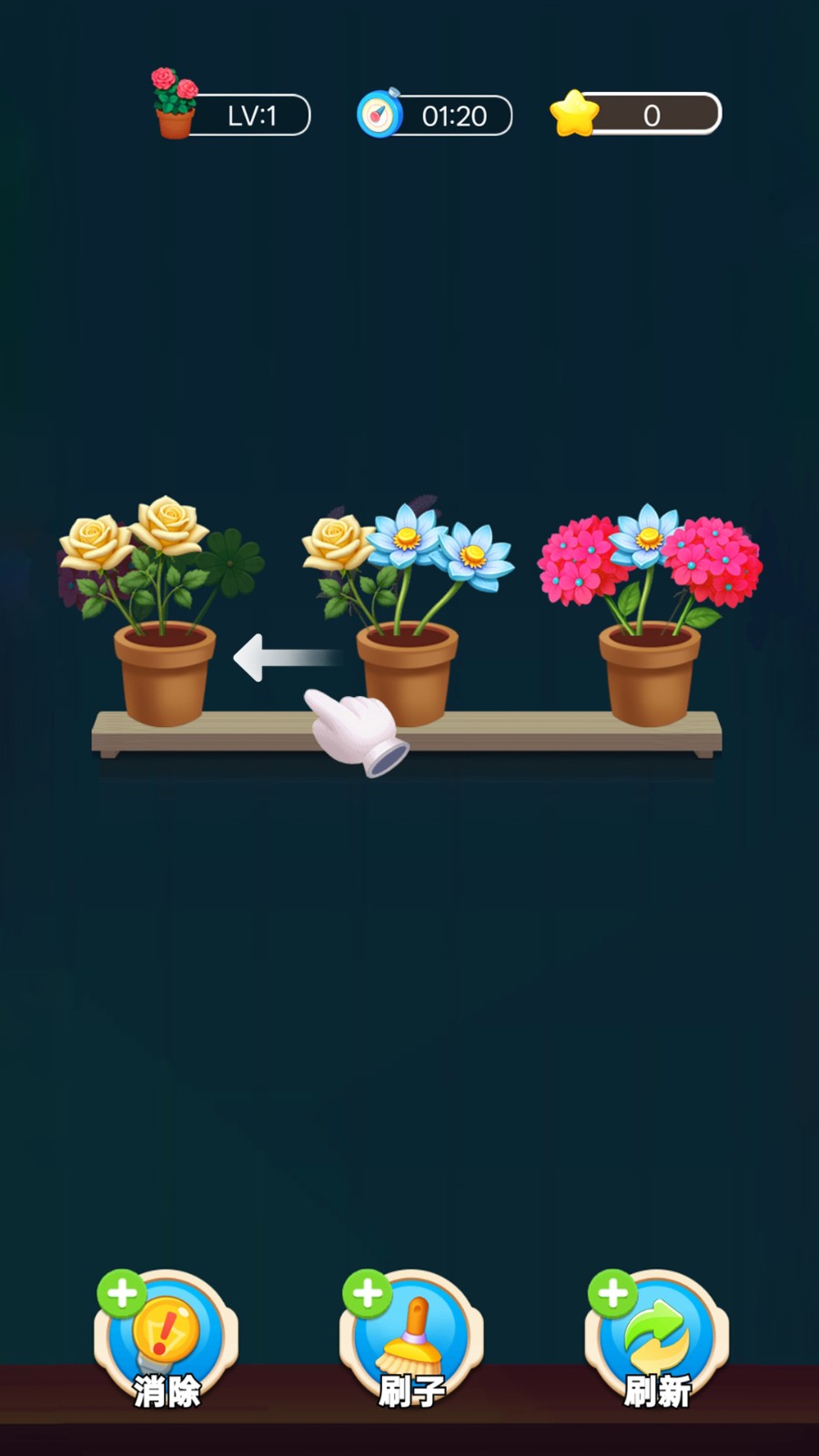 2.拖动花朵时提前规划路径,避免反复移动浪费时间,优先将数量较多的花朵种类进行组合,减少场上花朵总量。