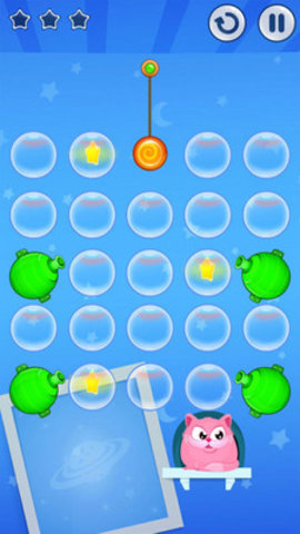 2.因为需要收集三个金色星星才能获得高分,所以最终目标是将挂在绳子上的糖果送入猫的嘴里。