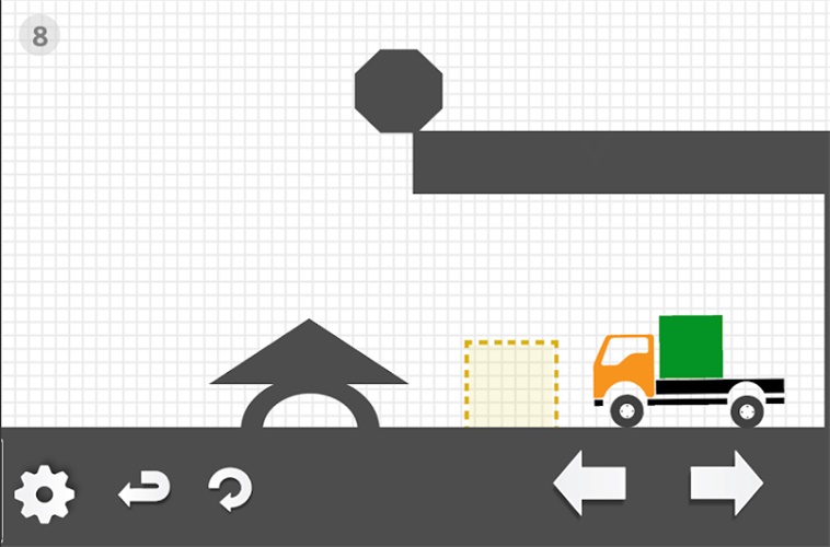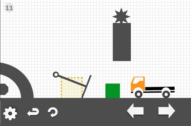 这一关中玩家们主要是在中间画上一条线段让两个台阶连在一起,这样卡车才能够顺利的向左移动到虚线框在的位置,这个还是比较简单的。