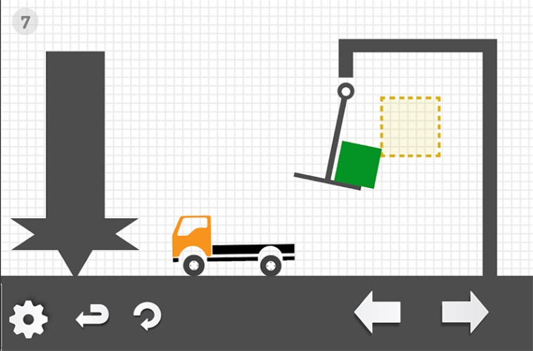 这一关中玩家们需要让卡车先向左移动,并且到达方块的左边,然后让卡车向右移动,将绿色的方块推到虚线框中去才能够过关。