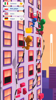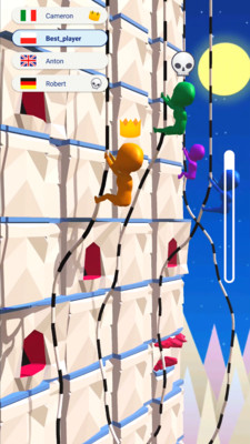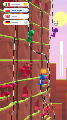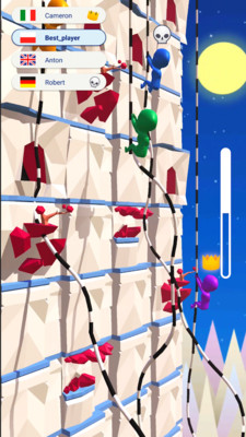 游戏采用了卡通的人物形象,使角色立刻生动起来在你攀爬的时候也需要技巧,努力的抓住绳子并向上攀爬,高清的游戏画面让让身临其境感受攀岩的乐趣和刺激,游戏的操作并不是很难,战胜对手后会有成就感。