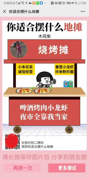 如今不管是白领还是网红都在晚上摆起了夜市摊,但是摊位却多种多样,一直在观望状态的你快来测试一下你到底适合什么样子的烧烤摊吧,根据你的第一直觉回答出问题的答案,简单的几道题就能测试出,也可以根据测试结果展开你的地摊经济哦。