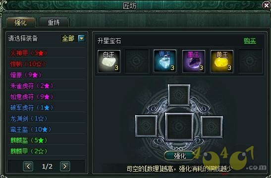 在9377《诸子百家》匠坊建筑里,可以指派司空对装备进行强化、重铸。强化可以提高装备星级和主属性数值,最高20星,需要消耗铜钱。重铸可以改变装备的副属性类别和数值。