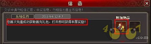 1、首次充值后,系统会以游戏信件方式将首充礼包发给玩家
